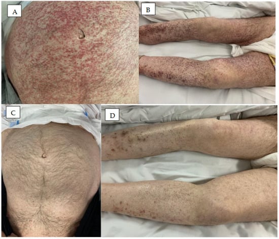 Rash in patients treated with BTK inhibitors. (A) Erythema multiforme on the skin of the lower limbs in a patient treated with ibrutinib for five weeks. (B) Erythema with vascular reaction on the feet and lower legs after three months of treatment with zanubrutinib. (C) Acute allergic-toxic erythema with a hemorrhagic component on the lower limbs after three weeks of treatment with ibrutinib. (D) Acute allergic erythema on the skin of the face and trunk in a patient treated for two weeks with ibrutinib.