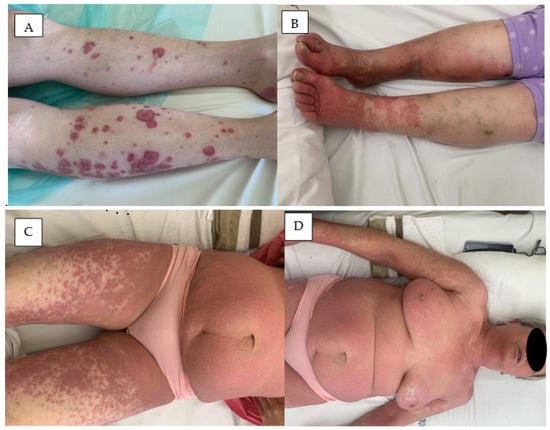 Acute febrile neutrophilic dermatosis (Sweet syndrome) (Figure 4A) is a rare skin condition characterized by a sudden onset of painful, inflamed skin lesions [57,58].