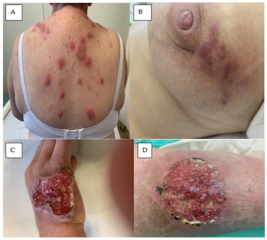 Pyoderma gangrenosum (PG) is a rare, inflammatory, ulcerative dermatosis affecting mostly people between 20 and 50 years of age [64]. It may be caused by some drugs, including small molecules like tyrosine kinase inhibitors (TKIs) or BTK inhibitors [65,66]. It most commonly manifests as pustules or nodules, developing into a painful ulcer with undermined violaceous borders and a fibropurulent base (Figure 4C,D) [67,68]. The lesions may be single or multiple, and the most prevalent locations are the lower limbs, followed by the trunk; it can also manifest as arthritis or a hematologic disorder.