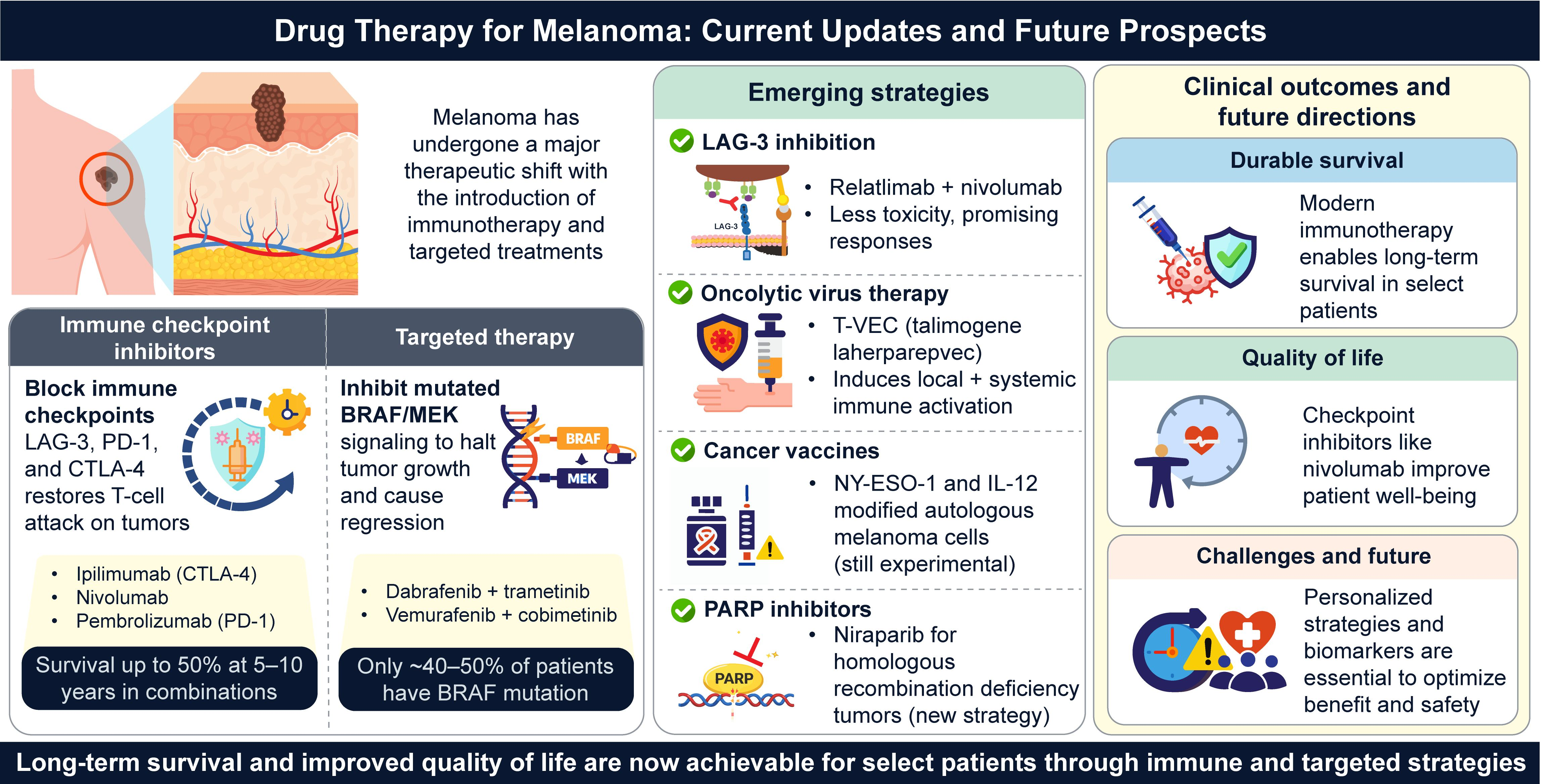 In summary, current drug therapies have dramatically improved the prognosis of melanoma. However, ongoing research, clinical trials, and real-world data will continue to guide best practice. The ultimate goal is to increase the proportion of patients achieving sustained remission or cure, minimize treatment-related complications, and deliver personalized therapy tailored to tumor and patient characteristics.