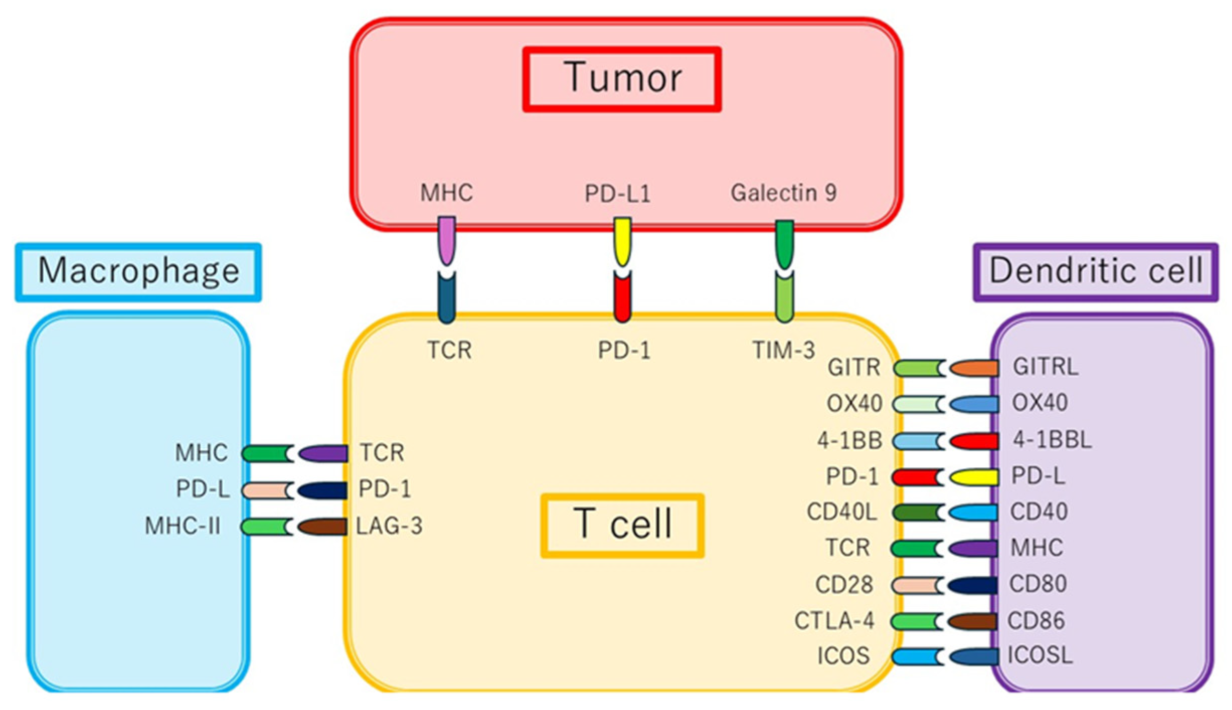This schematic illustrates key interactions among tumor cells, T-cells, dendritic cells, and macrophages. It highlights the following: