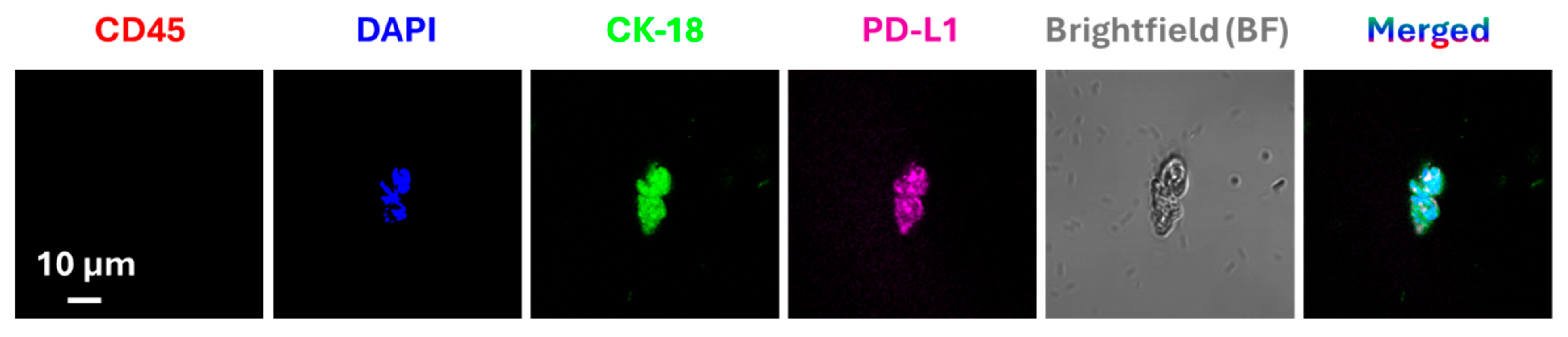 - Khandare, J.; Sabale, A.; Ramesh, R.S.; Jayant, S.; Aland, G.; Deshpande, T.; Kapse, S.; Jadhav, V.L.B.; Domadia, K.; Mishra, S.K.; et al. Comparative Analysis of Circulating Tumor Cell Distribution with PD-L1 Expression in Baseline and Follow up Patients across Cancer Types. J. Clin. Oncol. 2025, 43, e14540. [Google Scholar] [CrossRef]