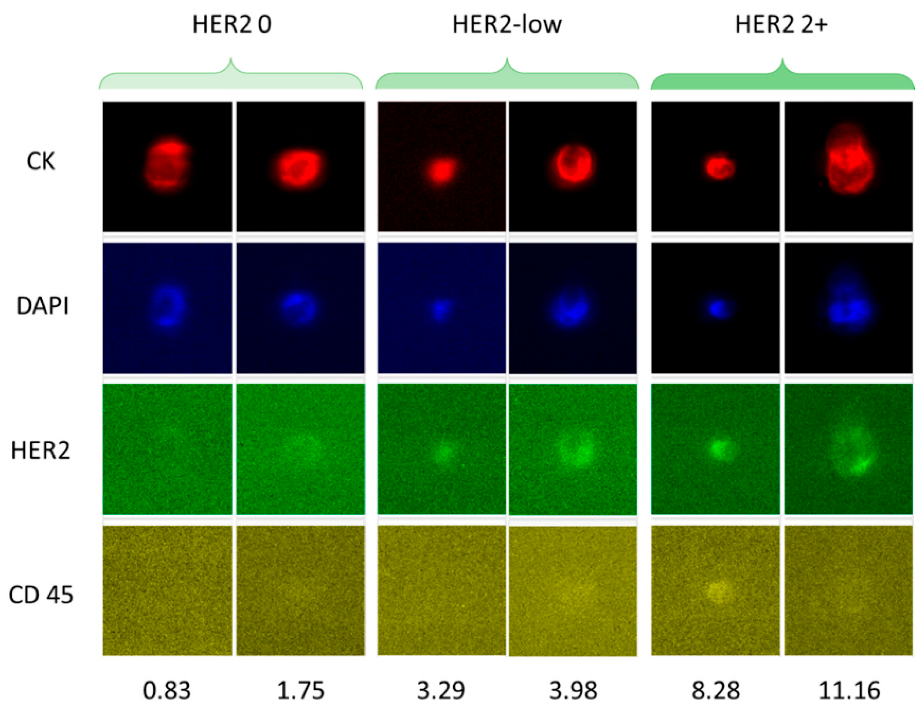 - D’amico, P.; Reduzzi, C.; Qiang, W.; Zhang, Y.; Gerratana, L.; Zhang, Q.; Davis, A.A.; Shah, A.N.; Manai, M.; Curigliano, G.; et al. Single-Cells Isolation and Molecular Analysis: Focus on Her2-Low Ctcs in Metastatic Breast Cancer. Cancers 2022, 14, 79. [Google Scholar] [CrossRef]