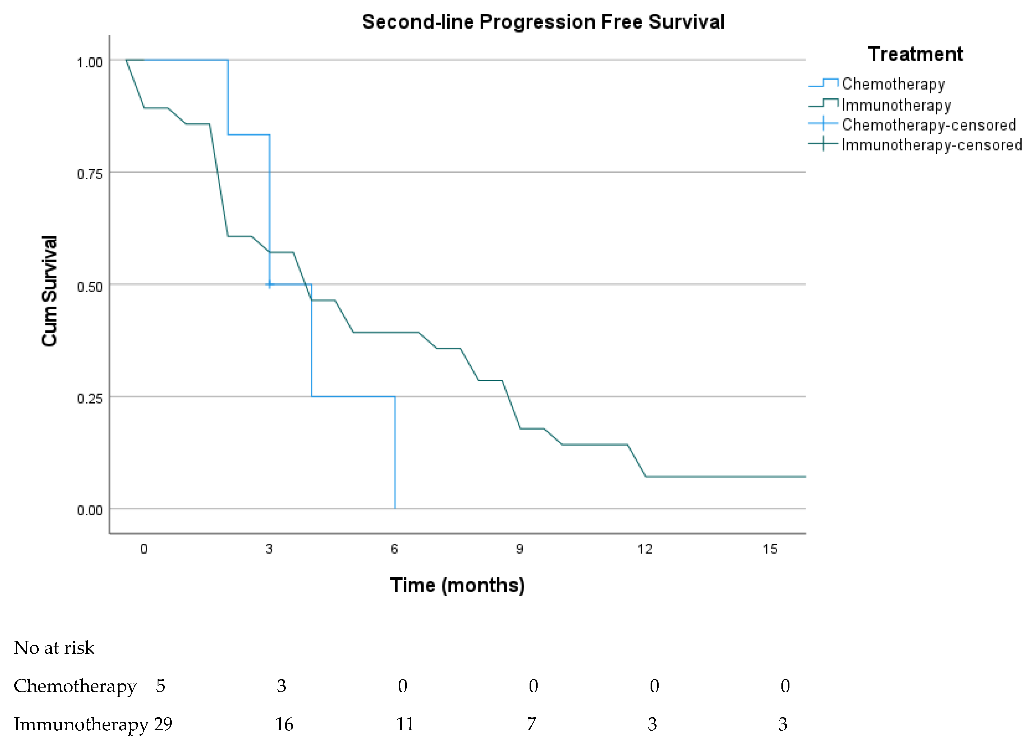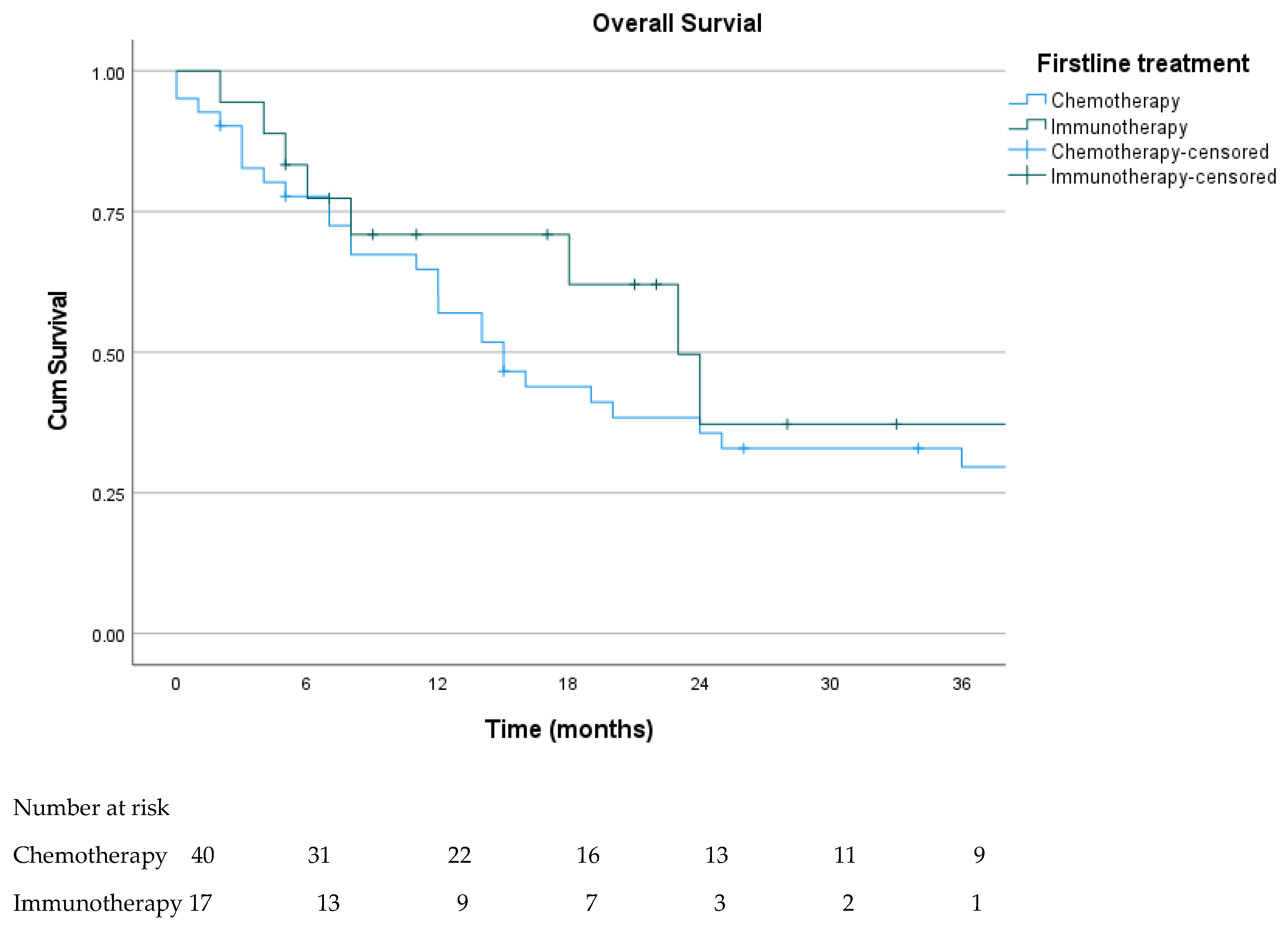 | First-line (N = 59) | Chemotherapy (n = 41) | 1 (2.4) | 7 (17.1) | 4 (9.8) | 19.5 | 29.3 | p = 0.19/0.05 |