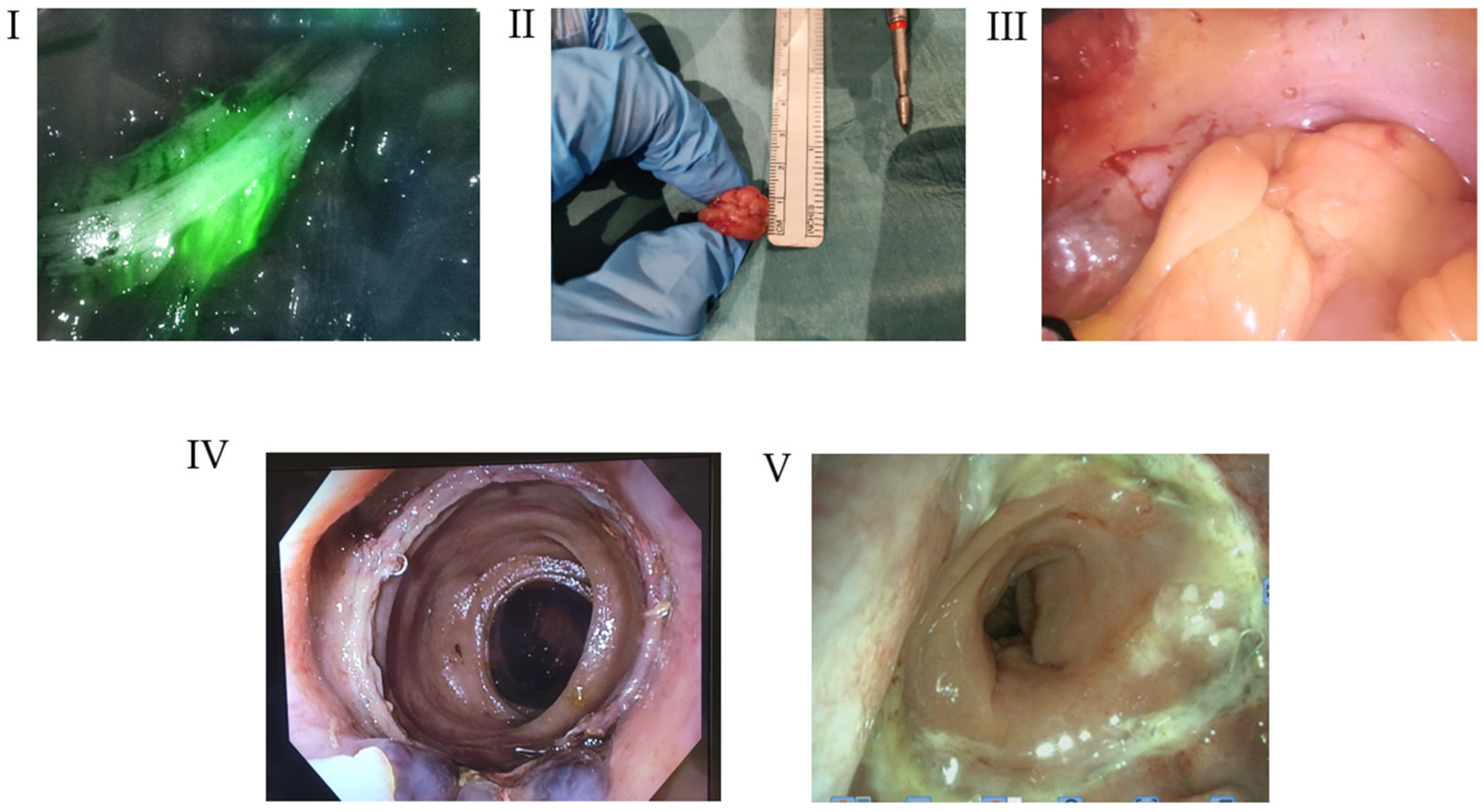 - Adams, E.D.; Salem, J.F.; Burch, M.A.; Fleshner, P.R.; Zaghiyan, K.N. Blinded Intraoperative Quantitative Indocyanine Green Metrics Associate With Intestinal Margin Acceptance in Colorectal Surgery. Dis. Colon Rectum 2024, 67, 549–557. [Google Scholar] [CrossRef]
