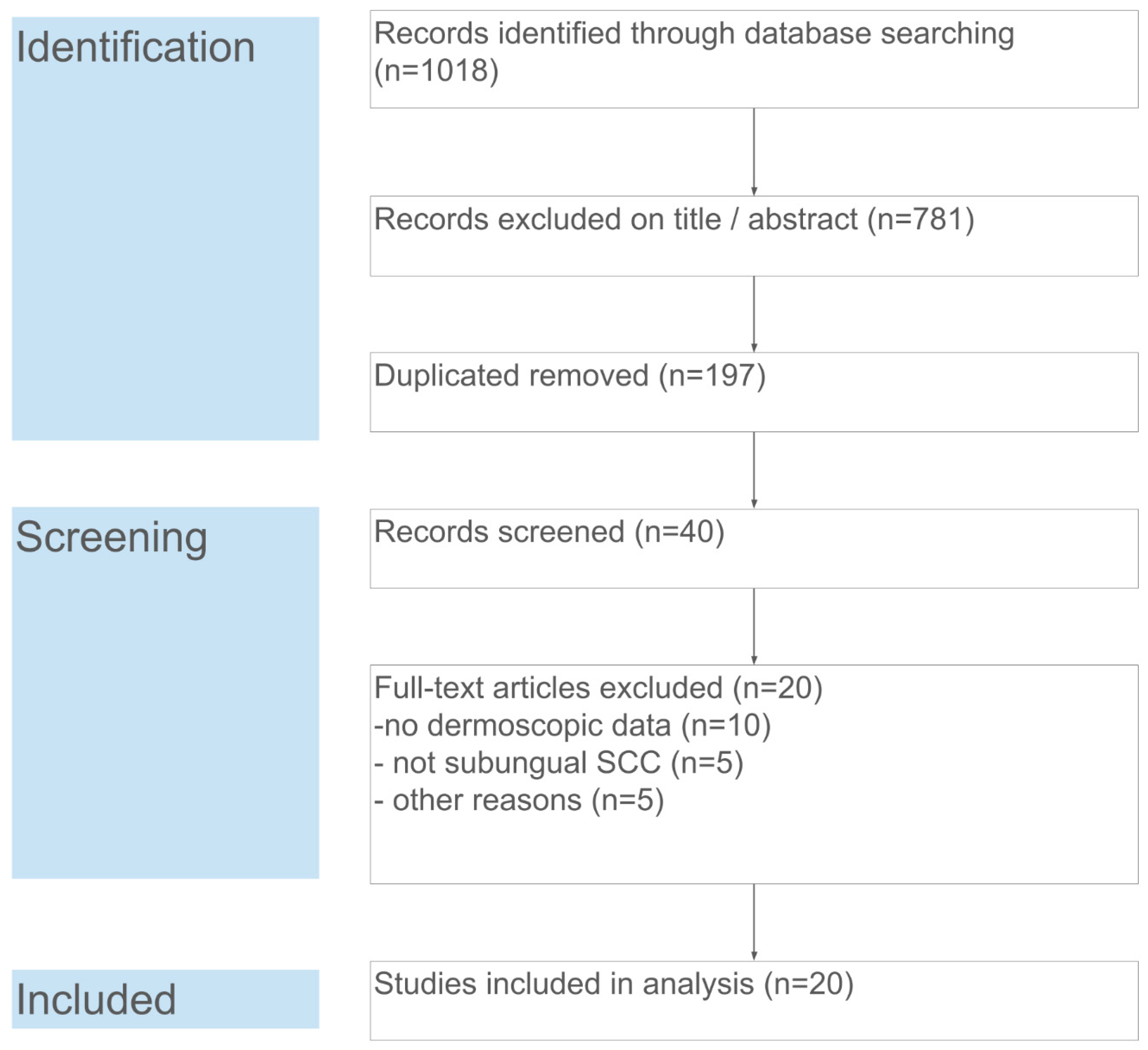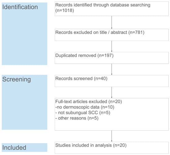 The database search yielded 1018 records. After removal of duplicates (n = 197), 821 unique records remained for title and abstract screening. Of these, 781 were excluded as clearly unrelated (e.g., not about nail tumors or not containing dermoscopic information). Forty full-text articles were assessed for eligibility, from which 20 articles were excluded for the following reasons: no dermoscopic data (n = 10), lesion not a subungual SCC (n = 5, e.g., periungual only or a different tumor), or other reasons (n = 5, such as non-English or irretrievable full text). Ultimately, 20 studies fulfilled the inclusion criteria and were included in the qualitative synthesis and meta-analysis. These studies collectively reported on 121 cases of subungual SCC. Figure 1 summarizes the study selection process in a PRISMA flow diagram.