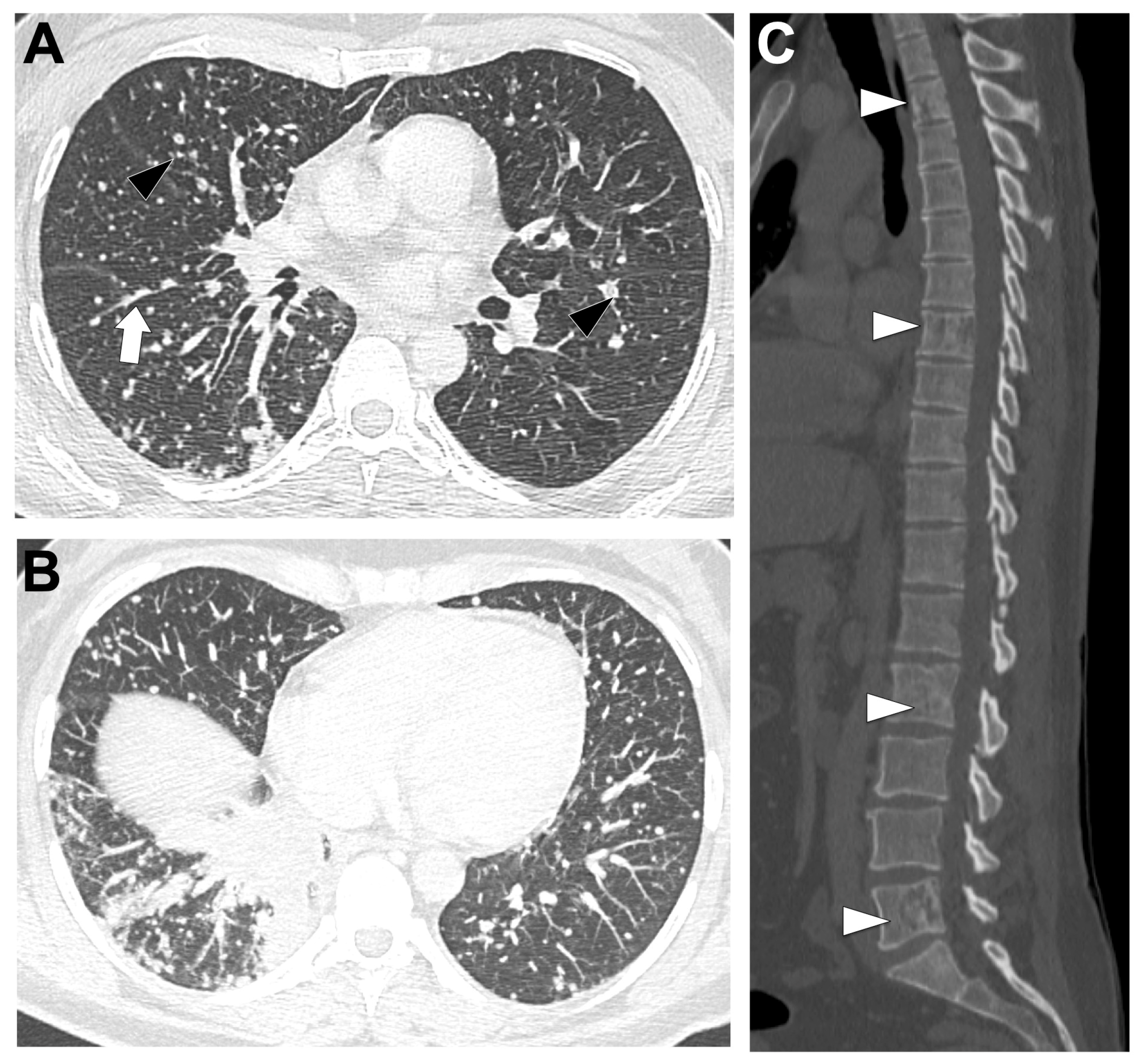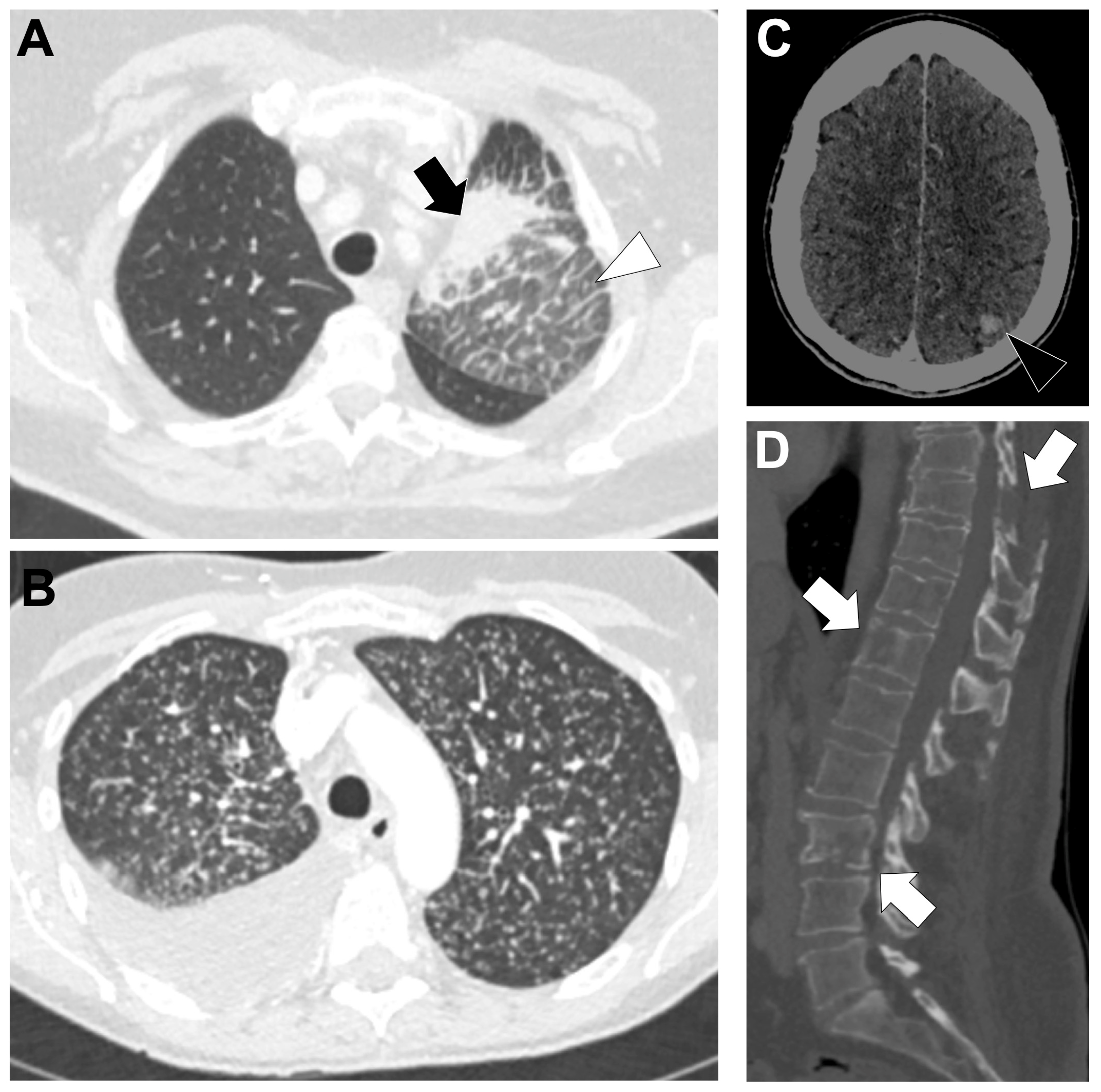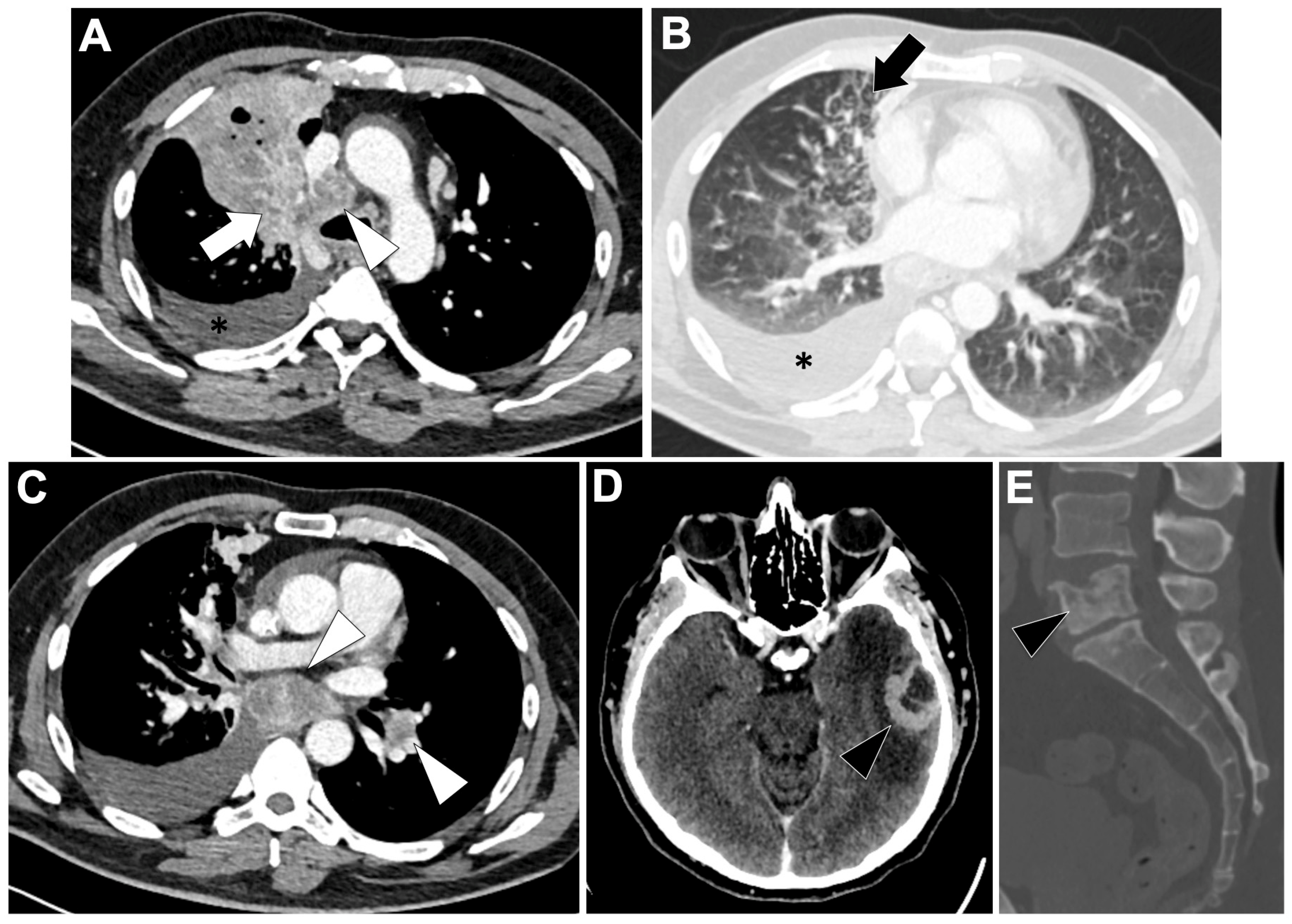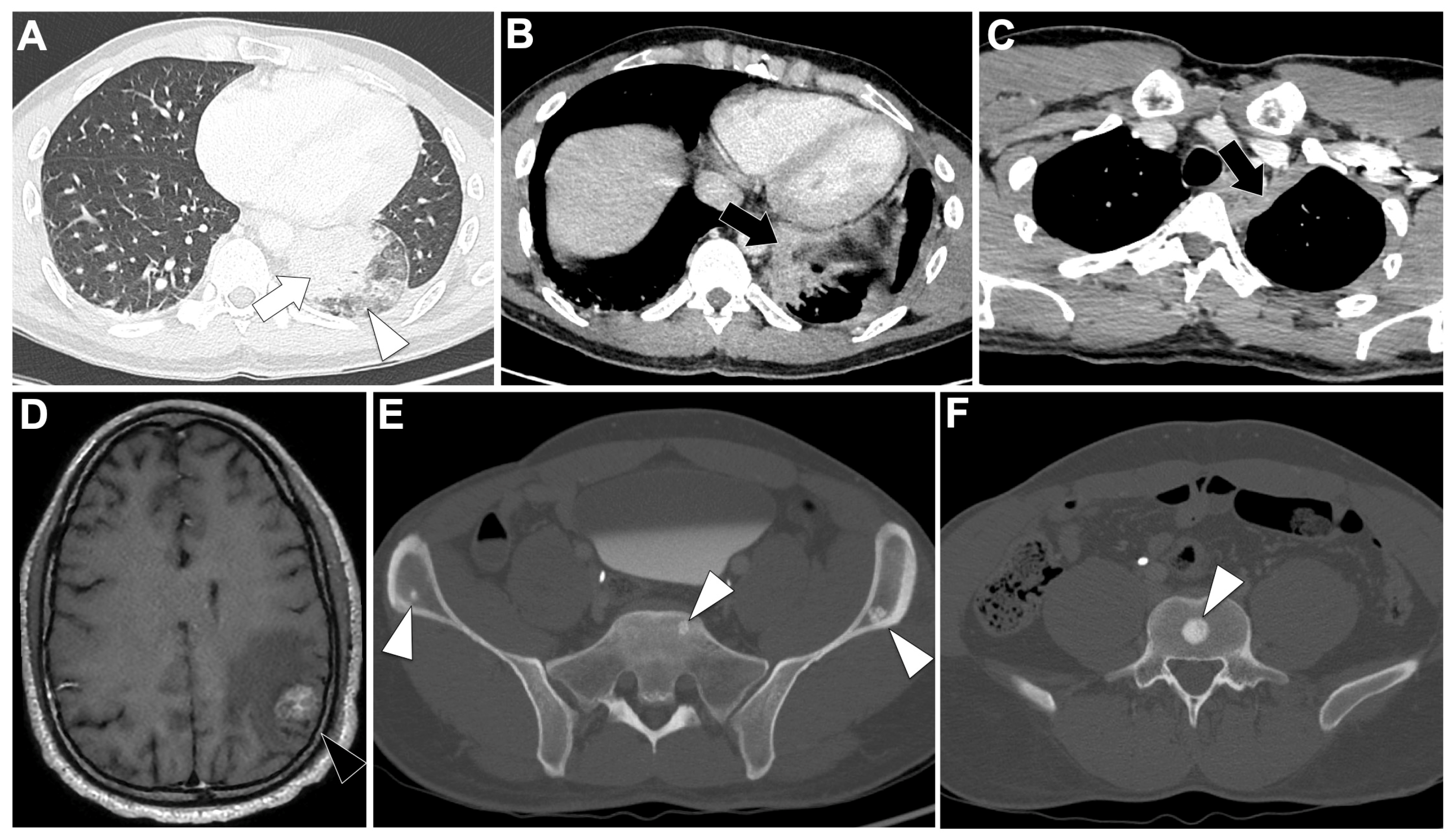 | Typical | Multiple bilateral pulmonary metastases/miliary, brain and bone metastases | Pleural metastases, lymphangitic carcinomatosis, bulky lymphadenopathy | Lung, brain, bone and adrenal metastases | Lymphangitic carcinomatosis, distant intra/extrathoracic nodal metastases, and sclerotic bone metastases | Brain, bone (possibly sclerotic), pleural, nodal and liver metastases | Bone metastases (lytic), brain and adrenal (necrotic) metastases | Heterogeneous patterns depending on alteration classes | Lymph node, brain, bone and lung metastases (multiple nodules, miliary) | Lymph nodes, bone, pleural, pulmonary and brain metastases |