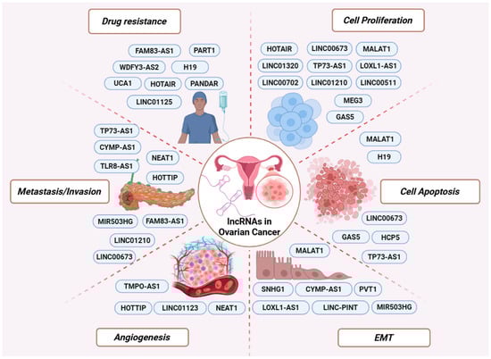 LncRNAs involved in major cancer-related processes. Representative oncogenic and tumor-suppressive lncRNAs are depicted according to their involvement in key aspects of OC biology, including drug resistance, cell proliferation, apoptosis, EMT, angiogenesis, and metastasis/invasion.