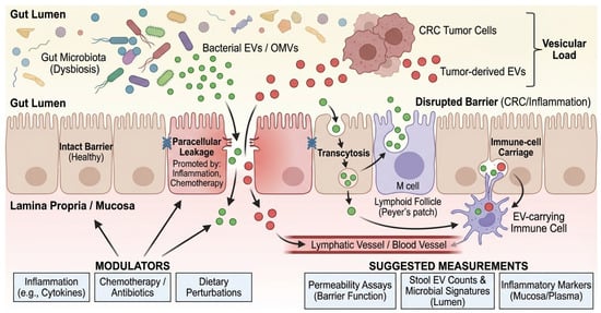 Cross-kingdom EV signaling requires a physical route from the gut lumen to systemic compartments. Proposed routes include (i) transcytosis across epithelial cells, including M cells over Peyer’s patches; (ii) paracellular leakage under tight junction disruption; and (iii) uptake by mucosal immune cells with subsequent lymphatic or hematogenous dissemination [74,75,76]. Beyond these general routes, mechanisms of cellular recognition differ by vesicle origin. Gram-negative OMVs are frequently internalized by non-phagocytic cells via clathrin-mediated endocytosis and lipid raft-dependent fusion, processes often triggered by the interaction of vesicular LPS with host TLR4 [47]. Conversely, Gram-positive MVs can deliver cargo via membrane fusion or interaction with TLR2. In the context of muscle, recent studies suggest that EVs may also exploit the ‘gut-lymph’ axis, bypassing first-pass hepatic clearance to reach systemic circulation and peripheral tissues more effectively than soluble mediators. CRC-related inflammation, chemotherapy, antibiotic exposure, and dietary perturbations can all modulate these routes, complicating attribution in both human cohorts and animal models. Furthermore, a major quantitative feasibility gap remains: even if barrier disruption facilitates translocation, it is currently unknown whether sufficient quantities of intact bacterial EVs bypass hepatic clearance and dilution in the systemic circulation to reach skeletal muscle and trigger catabolism. Most mechanistic evidence relies on high-dose administration in mice; thus, physiological relevance in humans awaits sensitive biodistribution studies. A schematic of barrier gating and proposed EV trafficking routes from the lumen to the muscle is shown in Figure 2. To facilitate implementation in human CRC cachexia cohorts, we summarize a prioritized minimal measurement set spanning stool and plasma EV/BEV readouts, barrier context, and longitudinal cachexia phenotyping (Box 2). However, it is crucial to acknowledge that although trafficking routes (transcytosis, paracellular leak) are well established in colitis and sepsis models, direct evidence that CRC-associated microbial vesicles physically reach and degrade skeletal muscle tissue remains a key knowledge gap that requires validation in specific CRC mouse models.