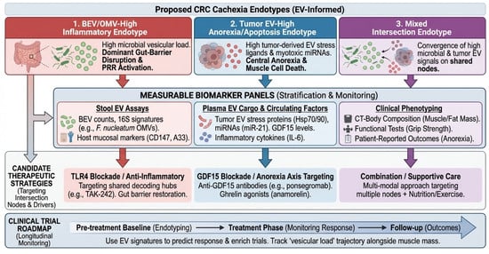 Proposed endotypes and a roadmap for biomarker-driven trials. Clinical translation framework mapping EV-informed endotypes onto measurable biomarker panels and therapeutic strategies. The three top boxes define distinct patient endotypes, color-coded for clinical stratification: red for BEV/OMV-high inflammatory, blue for tumor EV-high anorexia/apoptosis, and purple for the mixed intersection endotype. Vertical colored arrows indicate the flow from patient endotyping to specific biomarker panels (stool, plasma, and clinical phenotyping). The ‘Clinical Trial Roadmap’ at the bottom (large blue arrow) illustrates the longitudinal monitoring schema from pre-treatment baseline through follow-up.A33, GPA33 (Cell surface glycoprotein A33); BEV, Bacterial Extracellular Vesicle; CD147, Basigin (Cluster of Differentiation 147); CRC, Colorectal Cancer; CT, Computed Tomography; EV, Extracellular Vesicle; GDF15, Growth Differentiation Factor 15; IL-6, Interleukin 6; LPS, Lipopolysaccharide; OMV, Outer Membrane Vesicle; PRR, Pattern Recognition Receptor; SMI, Skeletal Muscle Index; TLR, Toll-like Receptor.