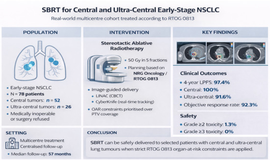 - Levy, A.; Adebahr, S.; Hurkmans, C.; Ahmed, M.; Ahmad, S.; Guckenberger, M.; Geets, X.; Lievens, Y.; Lambrecht, M.; Pourel, N.; et al. Stereotactic Body Radiotherapy for Centrally Located Inoperable Early-Stage NSCLC: EORTC 22113-08113 LungTech Phase II Trial Results. J. Thorac. Oncol. 2024, 19, 1297–1309. [Google Scholar] [CrossRef]