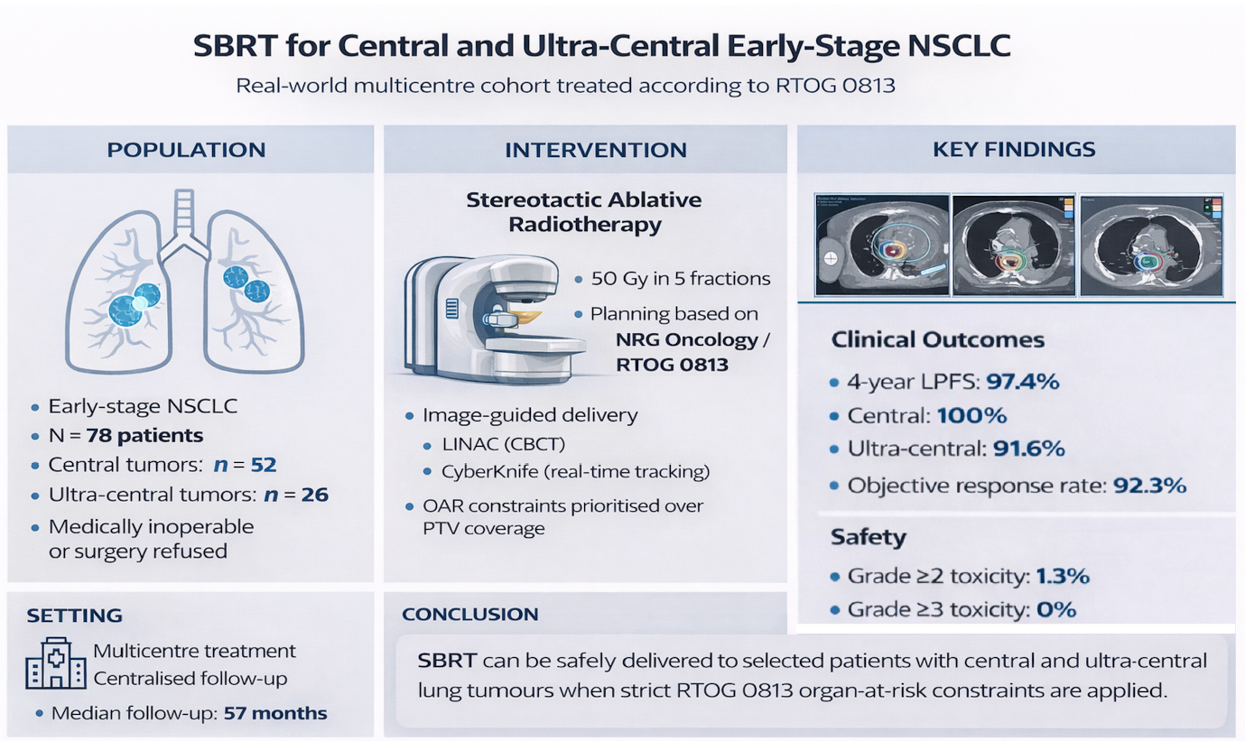 Zygogianni, A.; Kougioumtzopoulou, A.; Platoni, K.; Protopapa, M.; Liakouli, Z.; Koukourakis, I.M.; Alexiou, D.; Stroubinis, T.; Armpilia, C.; Antypas, C.; et al. Real-World Data on the Safety and Efficacy of SBRT for Central and Ultra-Central Lung Tumors: A Retrospective Multi-Center Cohort. Cancers 2026, 18, 653. https://doi.org/10.3390/cancers18040653