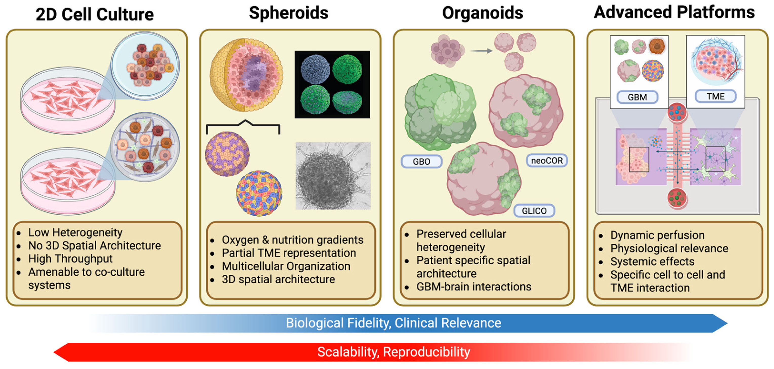 | spheroids | Cell lines; patient tissue (TDTS, OMS); neurospheres | Hypoxia/nutrient gradients; rim-core organization; basic cell–cell/ECM interactions | Drug penetration and resistance screens; viability/proliferation; invasion; imaging; bulk/single-cell omics | High | Days–1 week | $ | Low–Mod | No vasculature or BBB; ECM architecture limited; size variability | [30,32,33,42,43,44,47,50,53,55,56,59,60,61,63] |