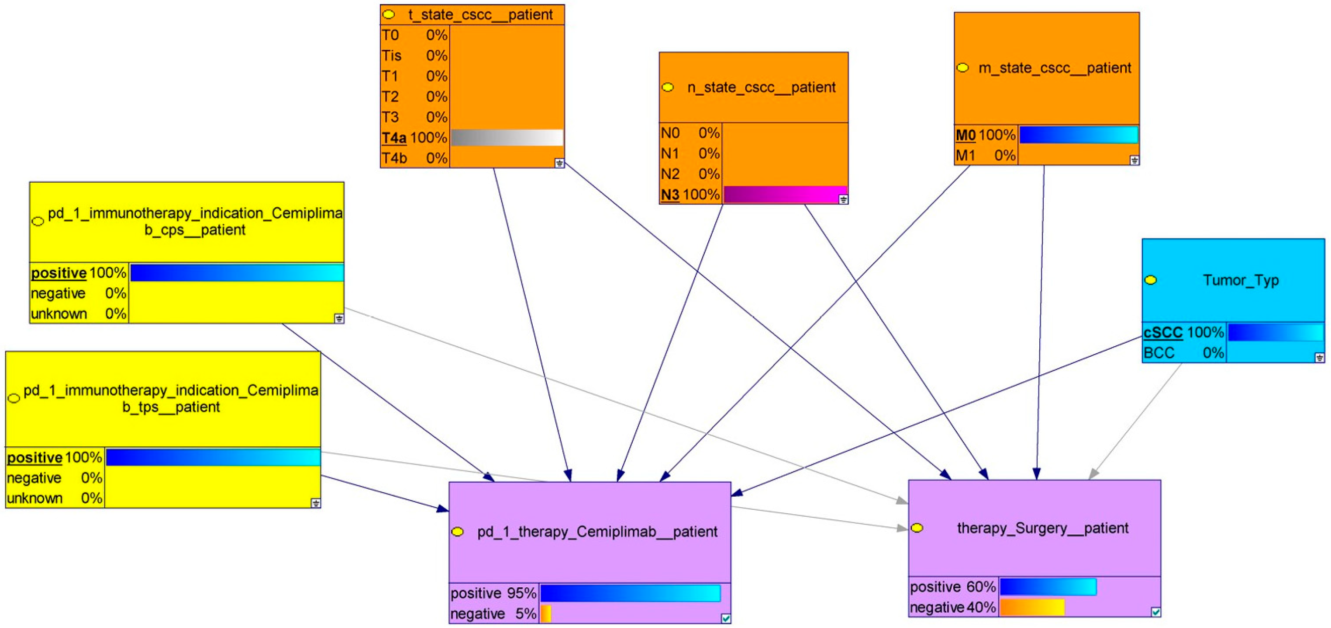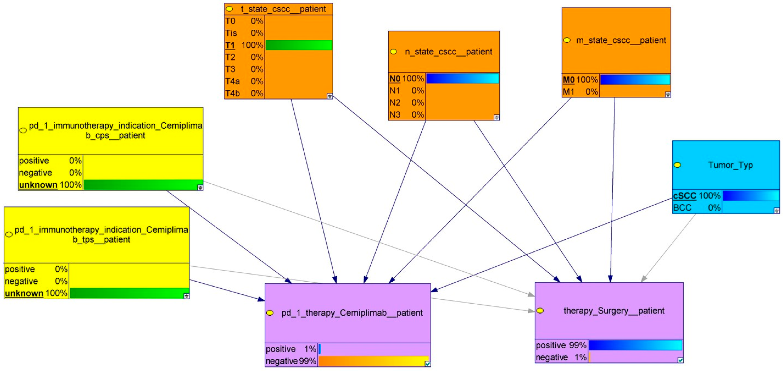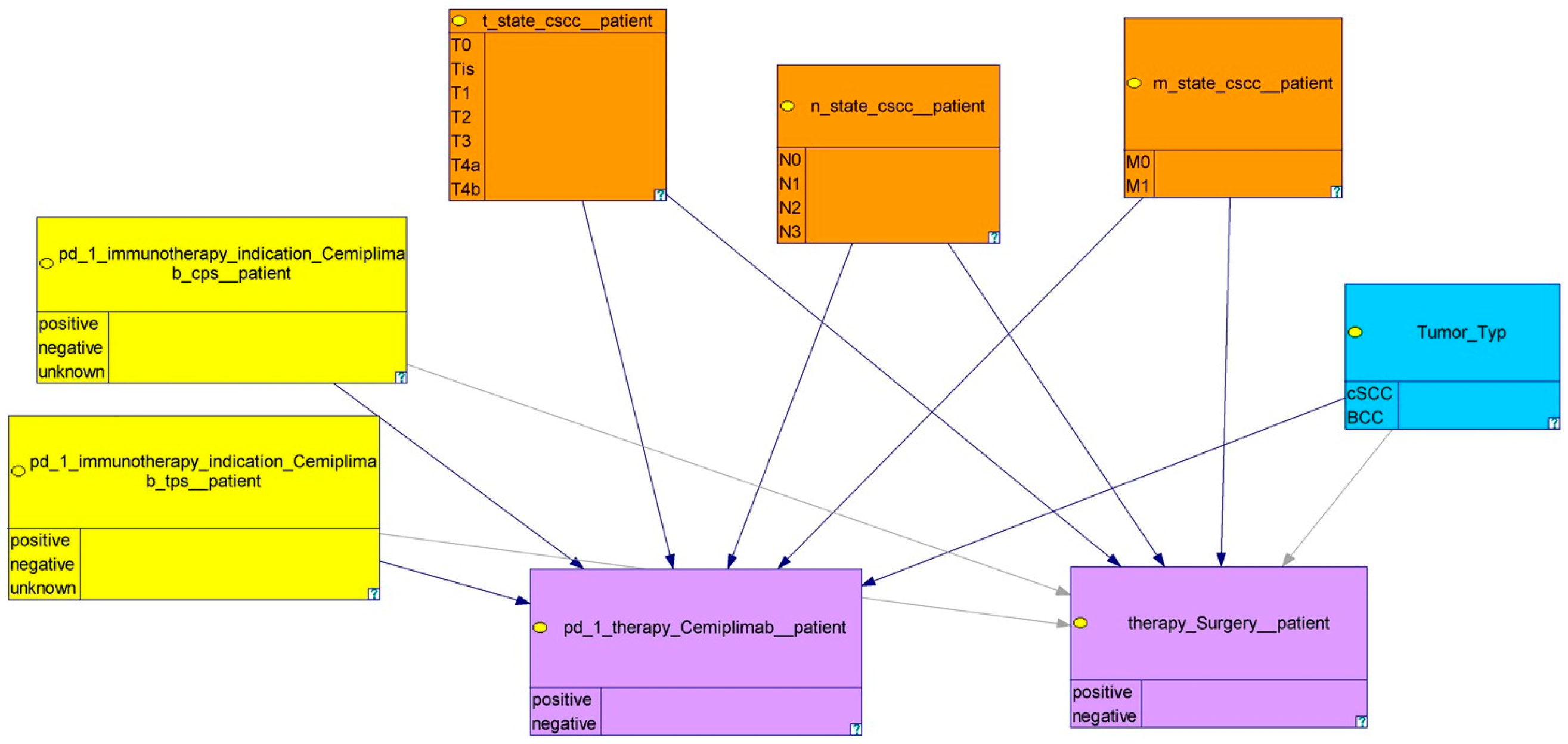- Huehn, M.; Gaebel, J.; Oeser, A.; Dietz, A.; Neumuth, T.; Wichmann, G.; Stoehr, M. Bayesian Networks to Support Decision-Making for Immune-Checkpoint Blockade in Recurrent/Metastatic (R/M) Head and Neck Squamous Cell Carcinoma (HNSCC). Cancers 2021, 13, 5890. [Google Scholar] [CrossRef]