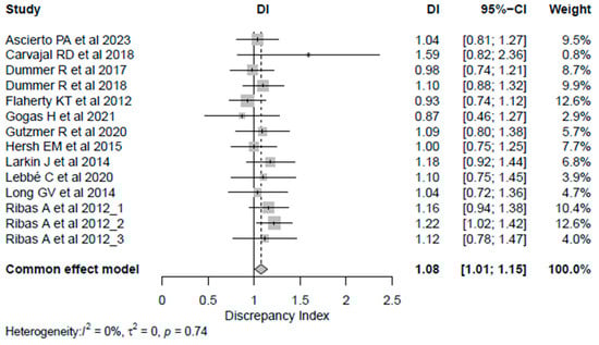 The funnel plot in Figure S2 in the Supplementary Materials illustrates symmetrical appearance, homogeneity, and a minimum sample size variation among the included studies, which indicates the absence of bias except for Carvajal RD et al. [20], which included a smaller sample size than most studies.