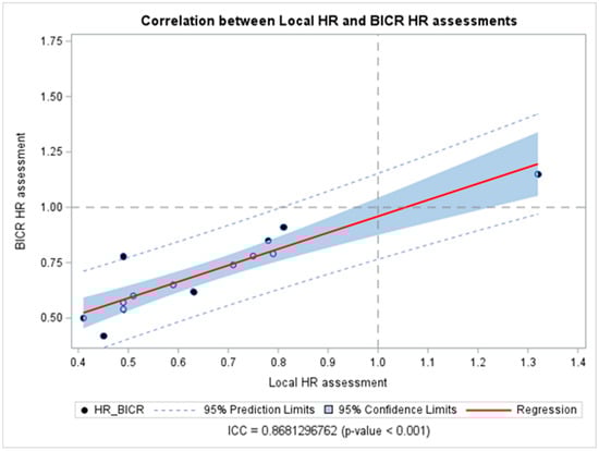 Correlation between hazard ratios obtained from blinded independent central review and local investigators’ assessments. Abbreviations: BICR: blinded independent central review; HR: hazard ratios; ICC: intraclass correlation coefficient.