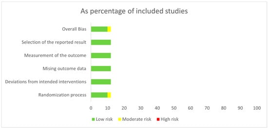 The risk of bias in each included study was evaluated by two independent investigators (I.E., E.J.) using the Cochrane Risk of Bias tool v.2 (RoB 2) available at https://www.riskofbias.info/welcome/rob-2-0-tool/current-version-of-rob-2 (accessed on 5 September 2024) [18]. The evaluation covered five domains: randomization process, deviations from intended interventions, missing outcome data, outcome measurement, and selection of reported results. Based on these domains, each study was classified as having a low, moderate, or high risk of bias.