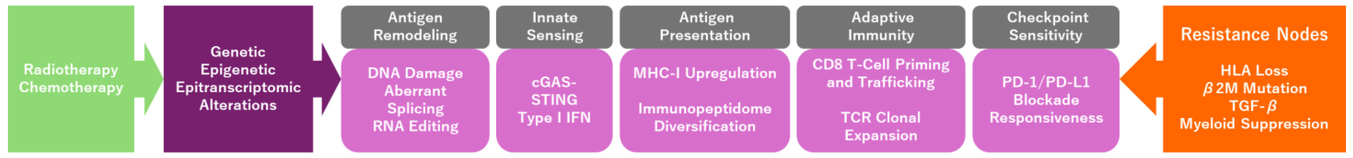 | Alternative splicing dysregulation → neojunction peptides | Stress/therapy (incl. chemoRT) | Epigenetic/transcriptomic | Splicing-derived neoantigens (neojunction peptides) | Creates “noncanonical” neoepitopes even in low-TMB tumors | [8,24] |