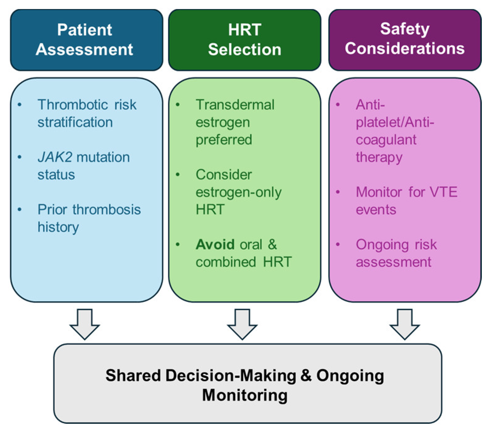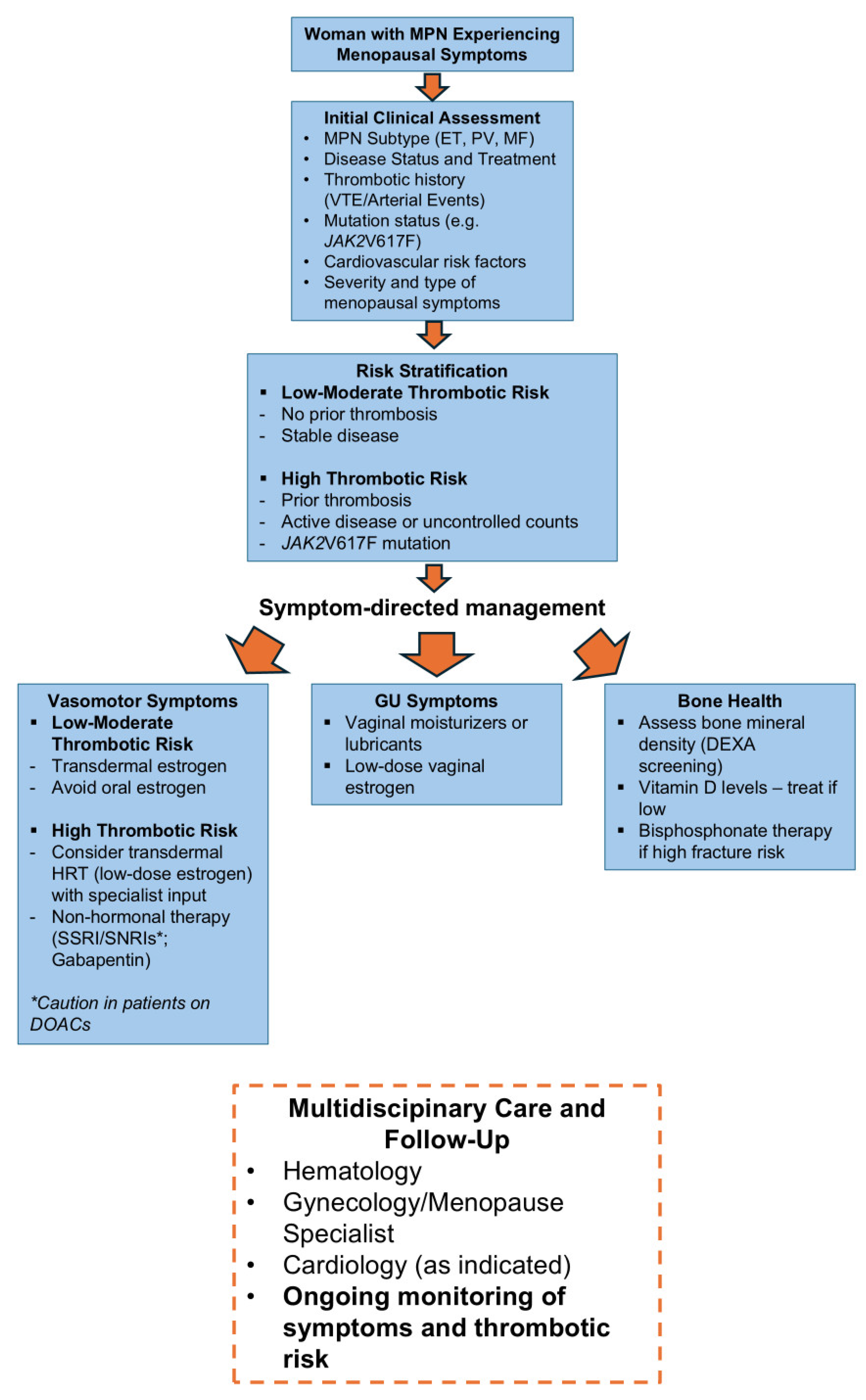 - Thrombotic risk is central: Decisions regarding systemic hormone replacement therapy must be individualized and guided by MPN subtype, thrombotic history, and overall cardiovascular risk.