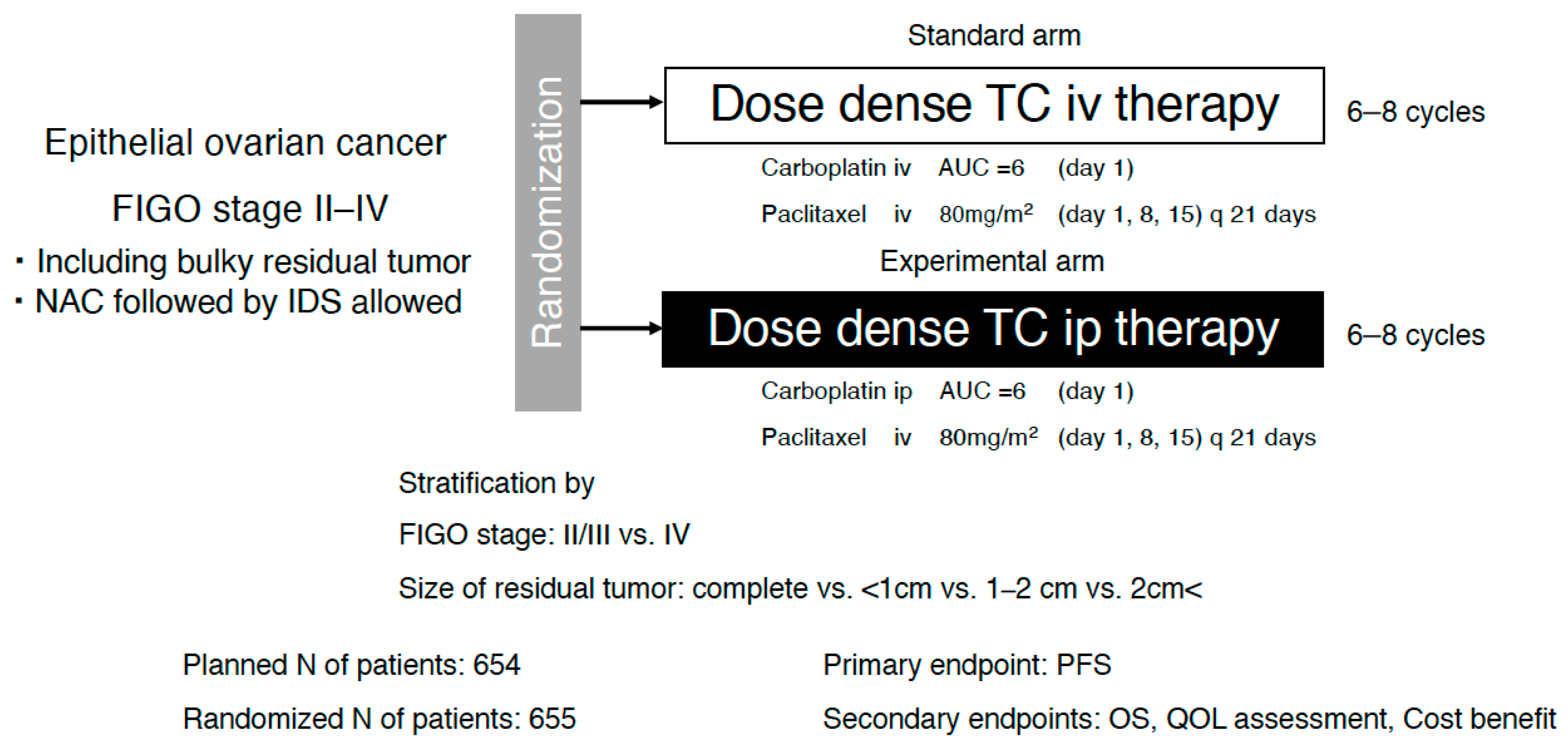 Following the success of GOG-104, subsequent trials were conducted under stricter surgical criteria (residual disease ≤ 1 cm) to further validate the IP approach. GOG-114 trial: This evaluated a regimen of 2 cycles of IV carboplatin (AUC = 9) induction followed by IV paclitaxel and IP cisplatin (100 mg/m
