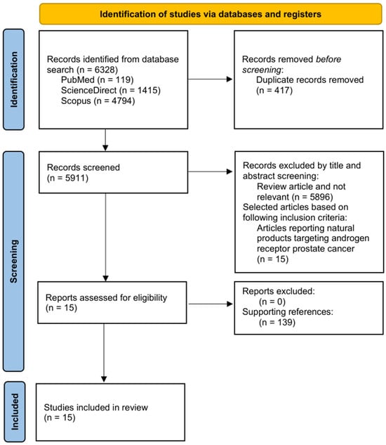 The initial database search yielded 6328 results: 119 from PubMed, 1415 from ScienceDirect, and 4794 from Scopus. To ensure the dataset contained only unique and relevant publication, duplicates and non-relevant studies were removed. After eliminating 417 duplicates, 5911 articles remained for title and abstract screening. During this stage, 5896 publications were excluded because they were reviews articles or were not related to the scope of this review. Only 15 publications met the inclusion criteria, focusing specifically on natural compounds that modulate androgen receptor signaling in prostate cancer. These 15 studies were then subjected to full-text evaluation, and no additional articles were excluded during eligibility assessment (n = 0). The final qualitative synthesis included all 15 eligible studies, and their findings were analyzed to determine how natural bioactive compounds interact with AR through various mechanisms, including the suppression of AR expression, activity, and nuclear translocation (neoisoliquiritin and α-terthienyl), degradation of the AR-V7 splice variant (α-mangostin), inhibition of AR biosynthesis by novel targets such as the transcription factor E2F8 (manzamine A), and modulation of alternative pathways, such as 5-α-reductase inhibition (Annona muricata compounds) or activation of the non-classical membrane receptor ZIP9 to induce apoptosis ((-)-epicatechin) in prostate cancer models within in silico, in vitro and in vivo studies. Figure 1 illustrates the comprehensive study selection process in accordance with the PRISMA flow diagrams. Additionally, the review was supported by the utilization of 138 references, thereby providing a robust scientific foundation.