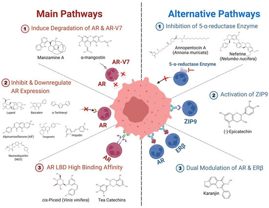 Plants produce phytochemicals as a defense against predators and pathogens and in reaction to environmental stress [32]. Major classes include polyphenols (stilbenes, phenolic acids, flavonoids), terpenoids (sesquiterpenes, monoterpenes, triterpenes), alkaloids, and sulfur-containing chemicals [33]. These chemical configurations allow phytochemicals to interact with cancer cells in numerous ways, providing many therapeutic effects. The antitumor mechanisms of phytochemicals include mitochondrial pathway apoptosis, cell cycle arrest at critical points, inhibition of tumor neovascularization and metastasis, inhibition of inflammation cascades, induction of detoxification enzymes, and epigenetic modifications [34,35,36]. Cancer is usually caused by complex, interconnected cellular regulatory mistakes; therefore, this wide mechanistic capability is very useful [37]. Phytochemicals’ multitarget action helps overcome tumor heterogeneity and cancer cell resistance [38]. To understand how these multitarget drugs treat prostate cancer, one must first understand the androgen receptor signaling pathway.