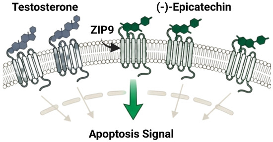 In Figure 6, prostate tumors that have progressed beyond the traditional nuclear androgen receptor (nAR) may be vulnerable to alternative therapeutic strategies involving non-genomic, membrane-initiated androgen signaling. Thomas and Dong (2021) reported that (-)-epicatechin has a novel mechanism that challenges prostate cancer androgen signaling studies [31]. (-)-Epicatechin strongly binds to ZIP9 (SLC39A9), a membrane androgen receptor, rather than the traditional nAR [127]. (-)-Epicatechin binds ZIP9 with 75% of testosterone affinity, while (+)-catechin acts as an inhibitor [128]. By engaging ZIP9, (-)-epicatechin “hijacks” the androgen signaling cascade converting it into a proapoptotic response [31]. This activation triggers G-protein-mediated pathways, leading to caspases 3 and 9 activation and subsequent programmed cell death [127]. Interestingly, similar effects were observed in PC-3 prostate cancer cells, an nAR-negative cell line that resists traditional endocrine therapy [128]. This discovery shows that membrane-initiated testosterone signaling can induce death in prostate cancer cells without the nuclear AR target [129]. It introduces an innovative approach to treating advanced, therapy-resistant prostate malignancies beyond AR blocking [130]. Furthermore, some natural compounds demonstrate dual receptor modulation by influencing both androgen and estrogen signaling pathways.