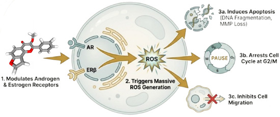 The study by Khan et al. demonstrated that the furanoflavonoid karanjin may regulate the complex hormonal balance involved in prostate cancer progression through many complementary mechanisms [99]. In silico analyses revealed that karanjin function as a dual receptor modulator, with significant binding affinity for both the androgen receptor (AR) and estrogen receptor beta (ERβ) [131]. This dual mechanism indicates a broader therapeutic strategy, wherein a single medication can suppress the proproliferative AR pathway while simultaneously activating the antiproliferative ERβ pathway [132].