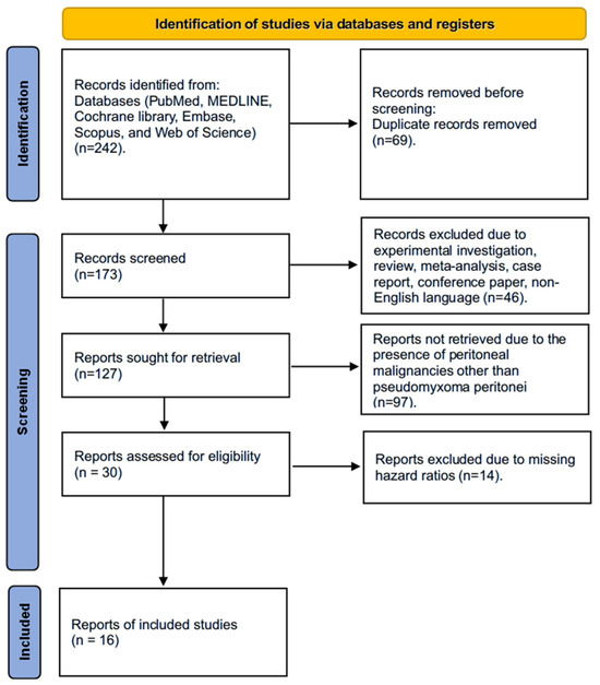 We identified 242 studies using the search strategy. Finally, this meta-analysis includes a total of 4009 patients diagnosed with PMP, derived from 16 studies published between 2002 and 2023, following the application of inclusion criteria. The detailed PRISMA flowchart illustrating the article selection process is presented in Figure 1. Excluded studies due to missing HRs for OS, PFS, or DFS are presented in Table S1.