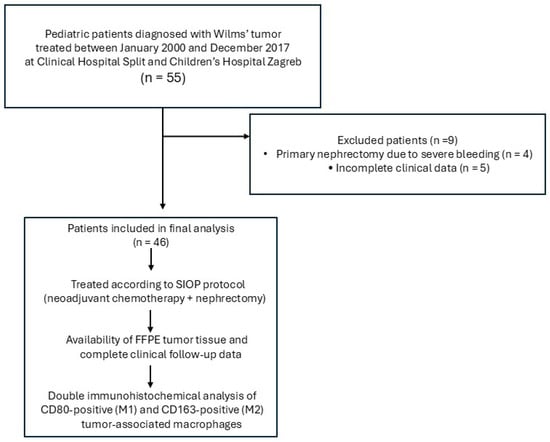 Flow diagram illustrating patient selection and study design. A total of 55 pediatric patients diagnosed with Wilms’ tumor were initially identified. Nine patients were excluded due to primary nephrectomy caused by severe bleeding (n = 4) or incomplete clinical data (n = 5). The final study cohort consisted of 46 patients treated according to the SIOP-RTSG protocol, which includes preoperative (neoadjuvant) chemotherapy followed by nephrectomy. Tumor specimens were obtained at the time of surgery for histopathological and immunohistochemical analysis. Postoperative chemotherapy, with or without radiotherapy depending on tumor stage and histological risk group, was subsequently administered according to SIOP guidelines. Tumor-associated macrophage subpopulations were analyzed using double immunohistochemistry.