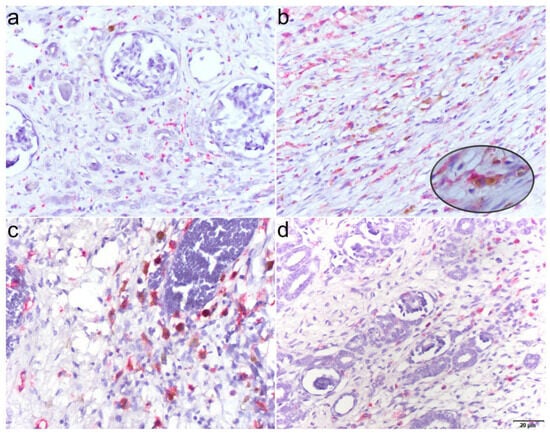Histological images depicting the distribution of M1 and M2 macrophages in normal renal tissue and Wilms’ tumor samples. Double immunohistochemical staining was used to mark CD80 positive (brown) M1 macrophages and CD163 positive (red) M2 macrophages. Low M1 and M2 macrophage density was present in normal renal tissue (a), while a high density was visible in areas of tumor regression. Insertion: CD80 positive (brown) M1 macrophages and CD163 positive (red) M2 macrophages (magnification of 400×) (b). M1 and M2 macrophages were present in the tumor stroma as well as in blastemal (c) and epithelial components (d). M2 macrophages were in general more abundant within the tumor microenvironment compared to M1 macrophages. All images were taken at a total magnification of 200×.