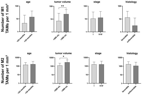 Graphs depicting the total number of M1 and M2 tumor-associated macrophages in Wilms tumor samples segregated by known prognostic factors (patient’s age at time of diagnosis, tumor volume, tumor stage, and tumor histology). Data are presented as the mean ± standard deviation (vertical line) and were analyzed using the Mann–Whitney U test. Significant differences are indicated by * p < 0.05 and ** p < 0.01.