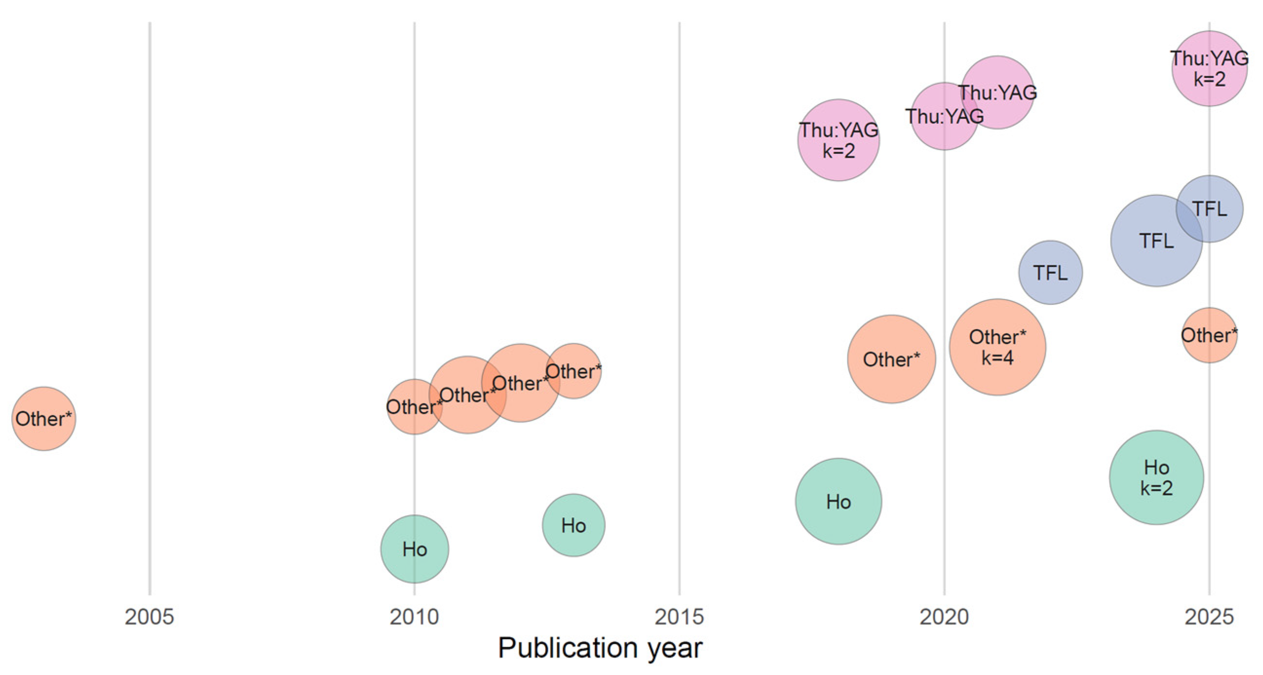 | Wen (2018) [28] | Tm:YAG (Vela XL, StarMedTec), CW/PW | 200–600 | 30–50 W | 7/32 (21.9%) | NR/32 | 0/32 (0.0%) | 3/32 (9.4%) | NR | NR | NR | NR | NR | NR | 4/32 (12.5%) | 4/32 (12.5%) | NR | NR |
