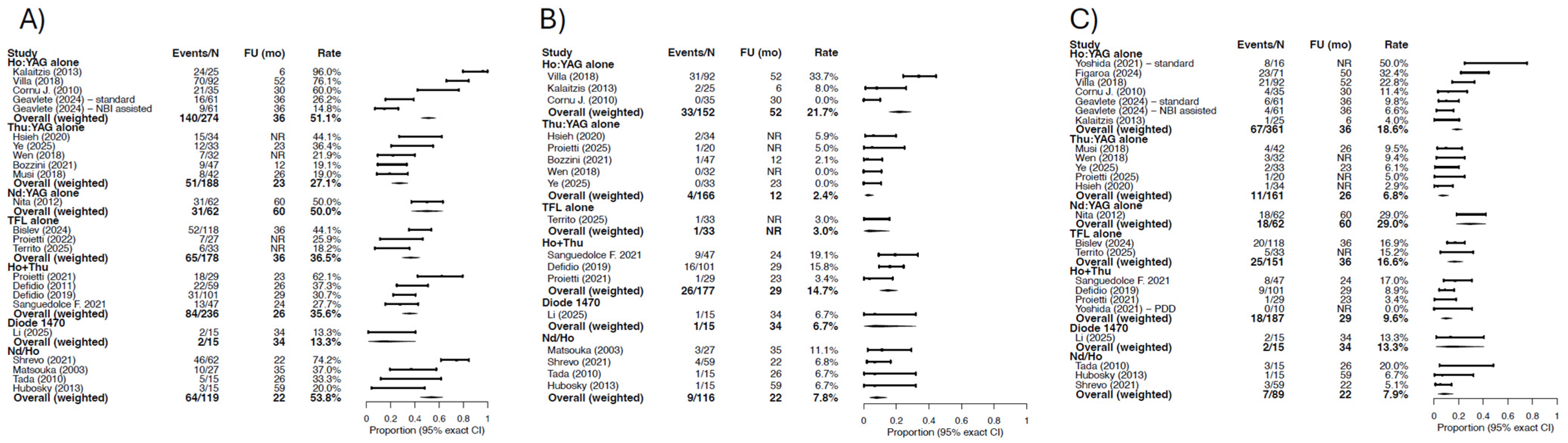 | Ye (2025) [20] | Tm:YAG (SRM-T120F, Youlu), CW | NR | 5–20 W | 12/33 (36.4%) | 4/33 (12.1%) | 0/33 (0.0%) | 2/33 (6.1%) | 64% | NR | NR | NR | NR | 1/33 (3.0%) | 4/33 (12.1%) | NR | 3/33 (9.1%) | NR |