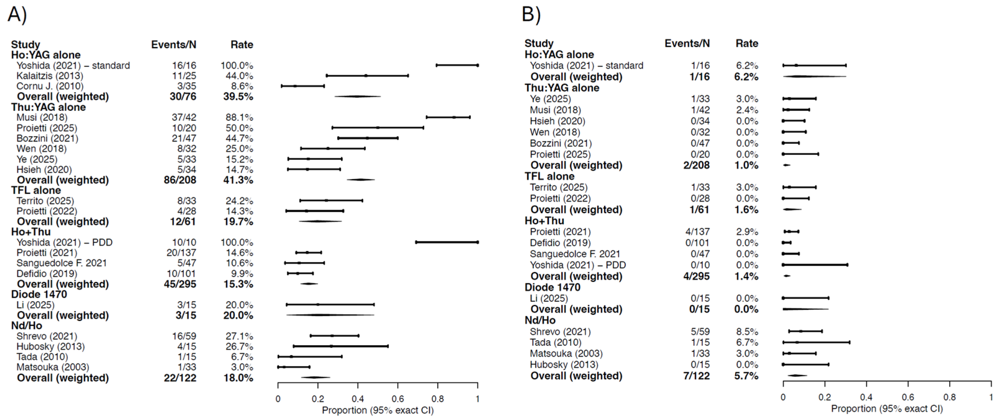 | Sanguedolce (2021) [30] | Ho:YAG and Tm:YAG, PW | NR | Ho:YAG 0.8–1.2 J; 8–12 Hz|Tm:YAG 10–15 W | 13/47 (28.3%) | 11/47 (23.4%) | 9/47 (19.1%) | 8/47 (17.0%) | NR | NR | NR | NR | 5/47 (10.6%) | 0/47 (0.0%) | 1/47 (2.1%) | 1/47 (2.1%) | 3/47 (6.4%) | NR |