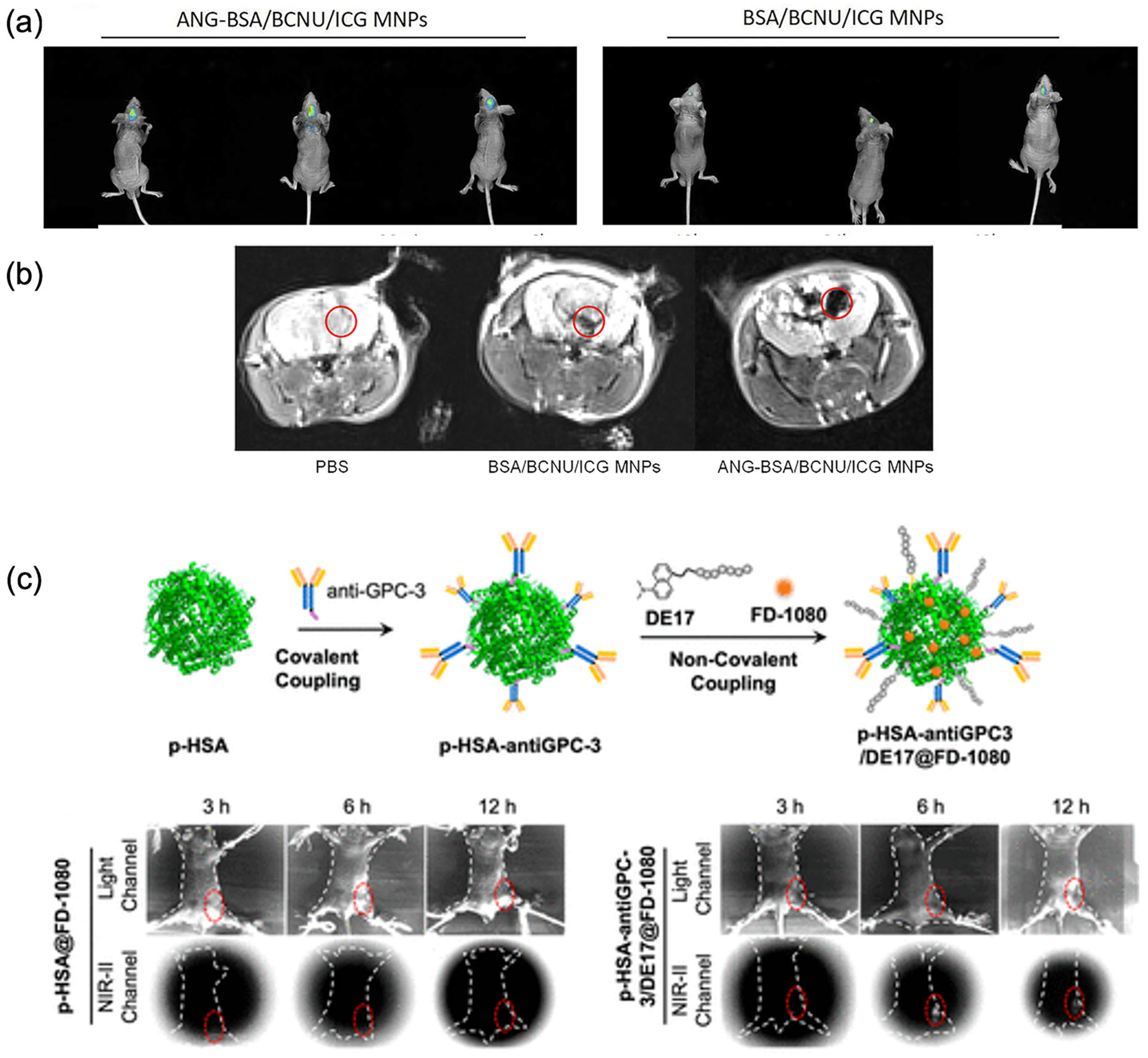 | Angiopep-2 functionalised BSA | 85 ± 10 nm | LRP | Carmustine (EE%: 15%) | ICG, superparamagnetic iron oxide/MRI and in vivo fluorescence imaging | Brain | In vitro (293T and U87MG cells) and in vivo orthotopic GBM nude mice | [119] |
