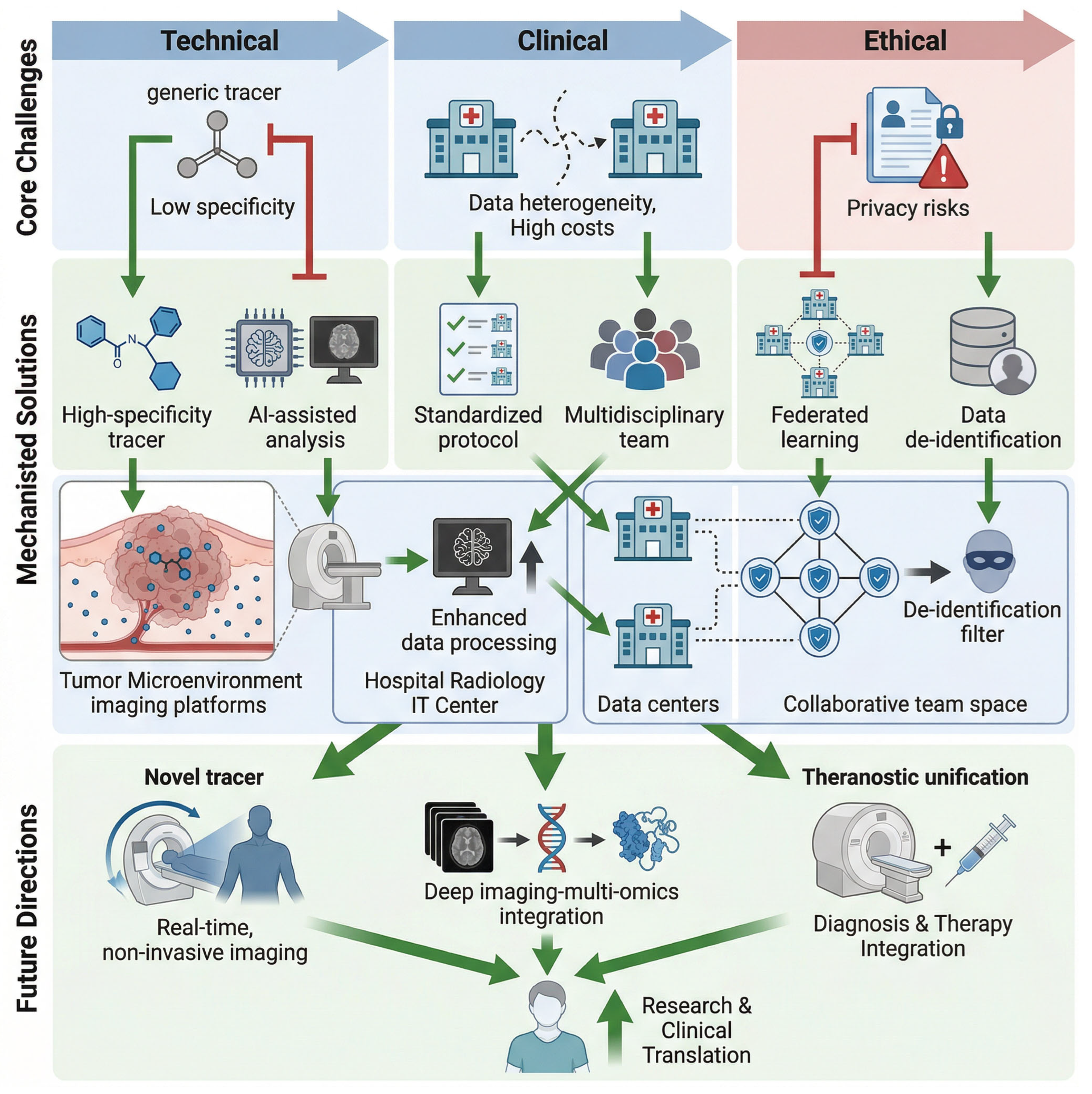 In summary, strengthening the education and training of professionals in functional and metabolic imaging is essential for advancing cancer treatment. By focusing on structured educational programs and interdisciplinary collaboration, the medical community can ensure that healthcare providers are equipped with the necessary skills and knowledge to leverage these advanced imaging techniques effectively. Future education and training efforts must prioritize: (1) the development of standardized, global curricula for functional and metabolic imaging for radiologists and oncologists; (2) hands-on training with low-cost, simulation-based tools for professionals in resource-constrained settings; (3) interdisciplinary certification programs for imaging-omics and AI-driven imaging analysis; and (4) continuous medical education (CME) programs to keep clinicians updated on the latest novel tracers and imaging technologies. This approach will ultimately lead to improved clinical outcomes, better assessment of treatment responses, and more informed decision-making in the management of cancer patients. To systematically summarize the core challenges, corresponding solutions, and long-term development trends of functional and metabolic imaging technologies, a hierarchical framework is presented in