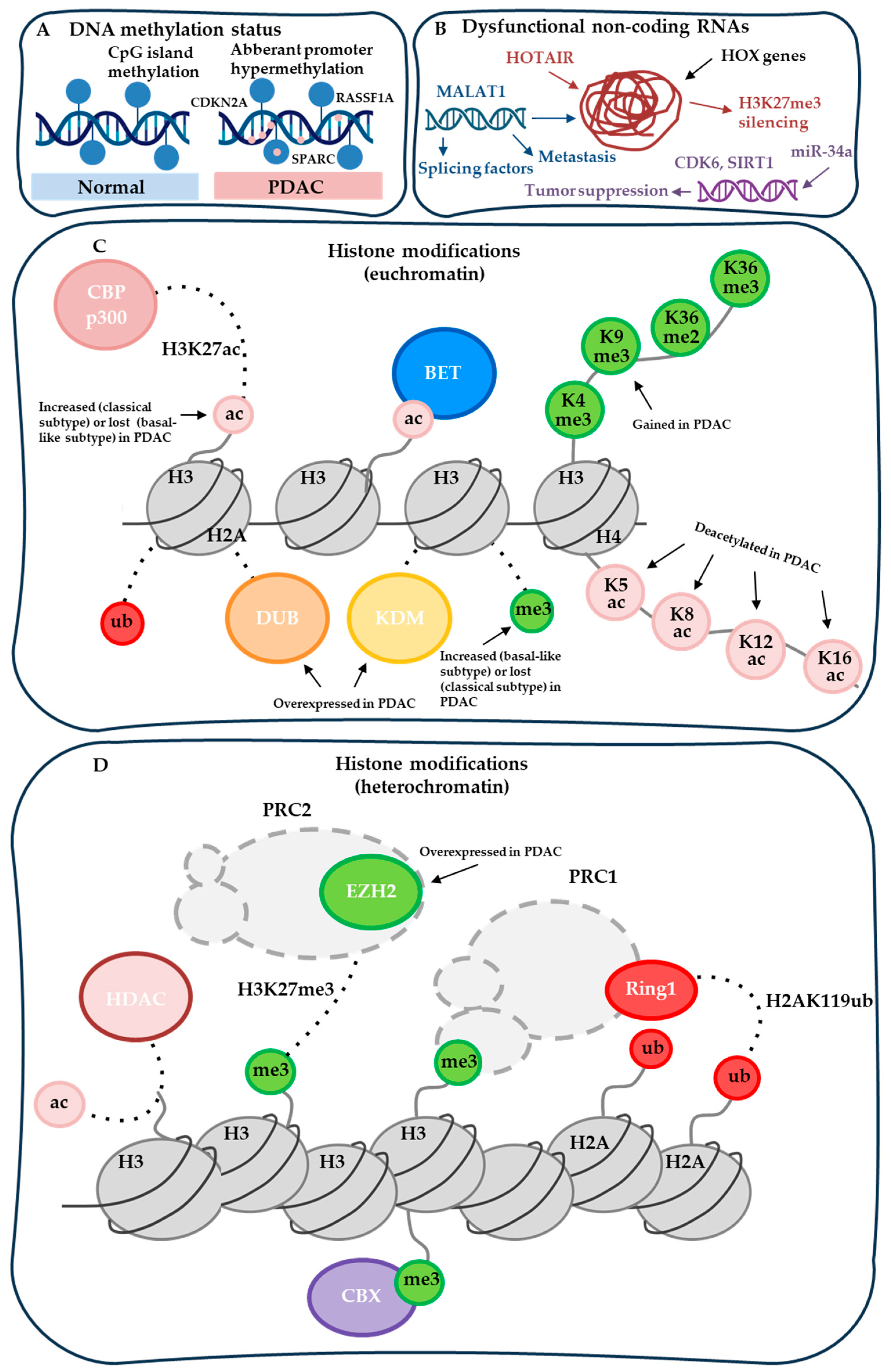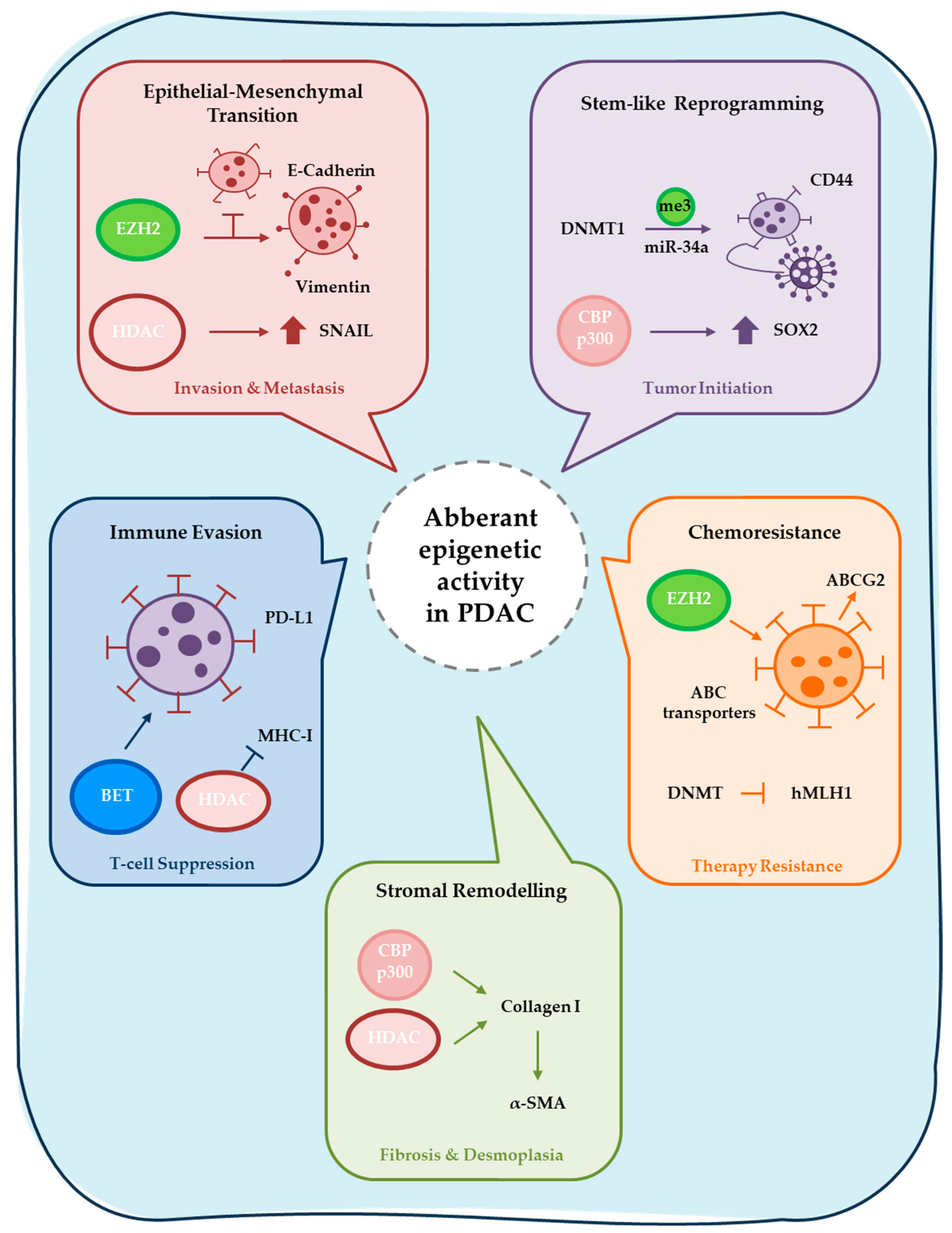 - HMGA1 (High Mobility Group AT-hook 1), a non-histone chromatin-binding protein that functions as an epigenetic modulator and reader-like factor. HMGA1 binds preferentially to AT-rich sequences in the minor groove of DNA, inducing conformational changes that alter nucleosome positioning, enhance chromatin accessibility, and facilitate recruitment of transcriptional regulators, co-activators, and epigenetic complexes [121]. In PDAC, HMGA1 is strongly overexpressed in tumor cells compared to normal pancreatic tissue, with high levels correlating with advanced tumor grade, dedifferentiation, lymph node metastasis, and poor overall survival [122]. Overexpression activates oncogenic transcriptional programs, including upregulation of genes involved in proliferation (via COX-2 axis), survival, and chemoresistance (to gemcitabine via Akt-dependent mechanisms) [123]. Critically, HMGA1 promotes key hallmarks of PDAC progression: it drives epithelial–mesenchymal transition (EMT) through repression of epithelial markers (E-cadherin) and activation of mesenchymal programs; enhances stem-like reprogramming by sustaining cancer stem cell properties; and contributes to aggressive biology in molecular subclasses, such as the HMGA1/FGF19-overexpressing subset associated with extremely poor outcomes and enhanced stroma formation [124]. Targeting HMGA1—via direct inhibitors, siRNA, or disruption of its interactions with epigenetic partners—represents an emerging strategy to attenuate PDAC aggressiveness, particularly in high-HMGA1 subsets [125]. Future studies should explore HMGA1 as a biomarker and therapeutic vulnerability in combination with epigenetic regimens.