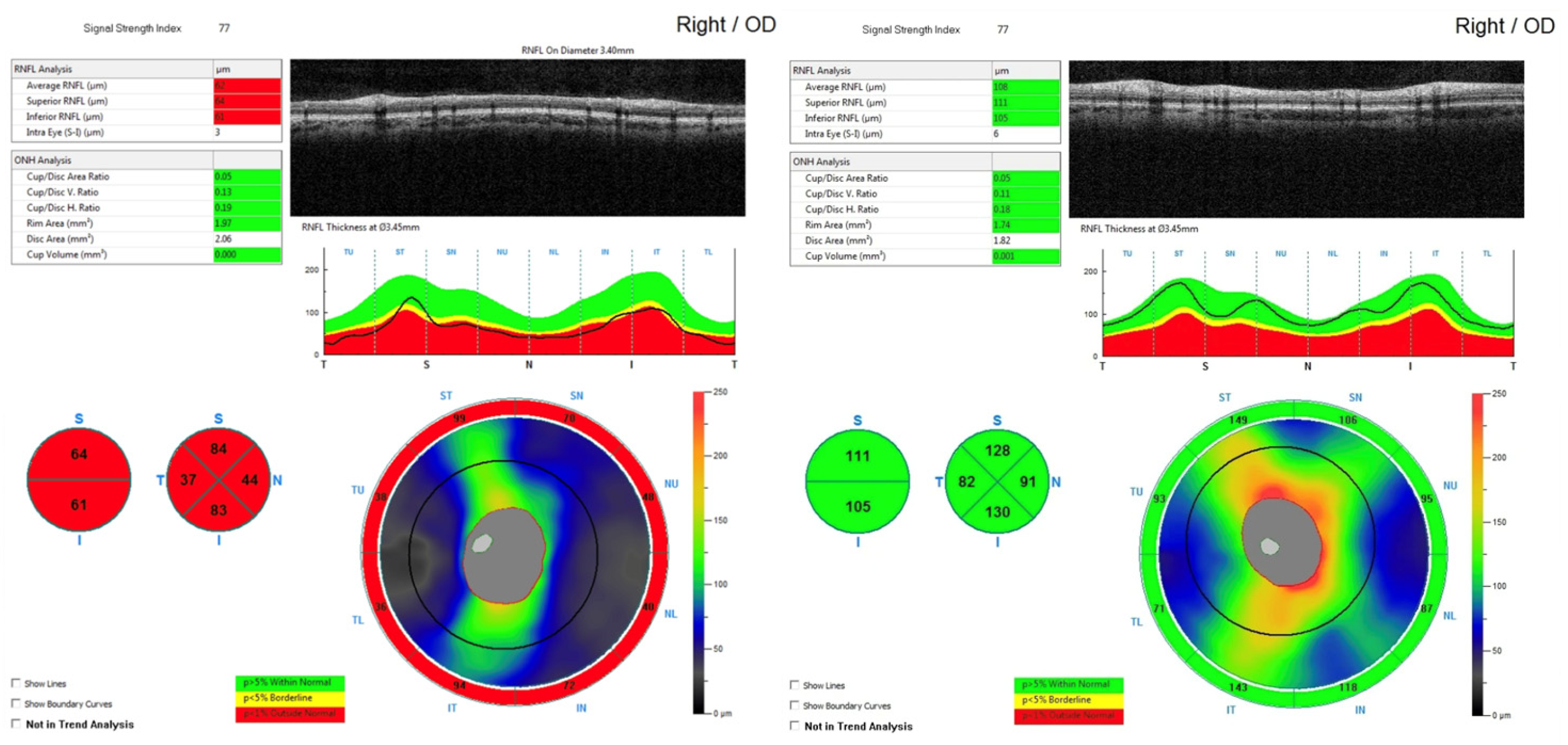 | Yang et al. [77] (2016) | Primary CP (Children and adult) | FD-OCT | RNFL | Significant RNFL thinning compared with controls before treatment. |