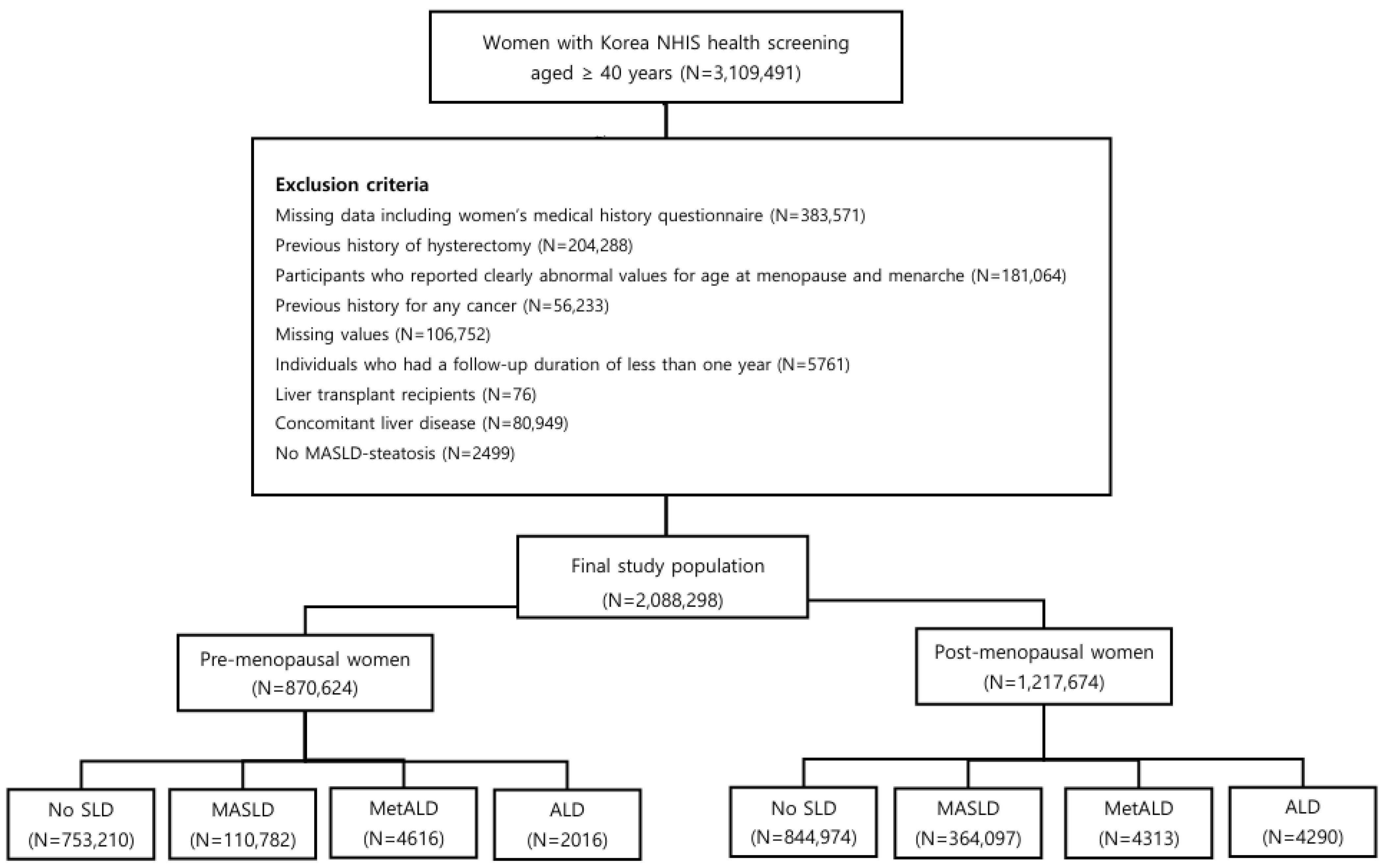 | Characteristics | Total N = 870,624 | No SLD N = 753,210 | MASLD N = 110,782 | MetALD N = 4616 | ALD N = 2016 | p-Value | Total N = 1,217,674 | No SLD N = 844,974 | MASLD N = 364,097 |