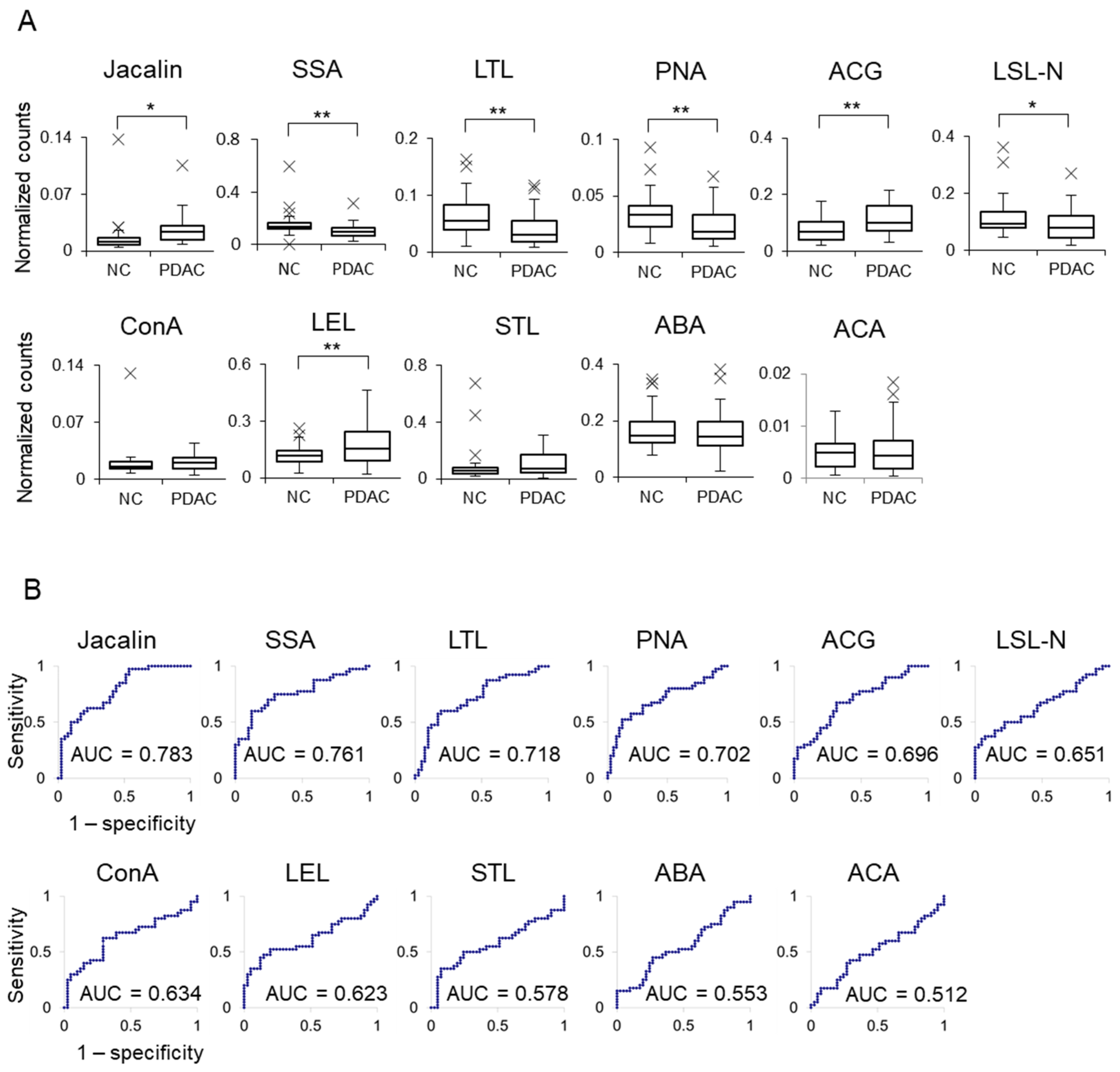 | Jacalin | 0.783 | 0.920 | 0.828 | Jacalin | ABA | 0.890 * | 0.971 * | 0.917 * |
