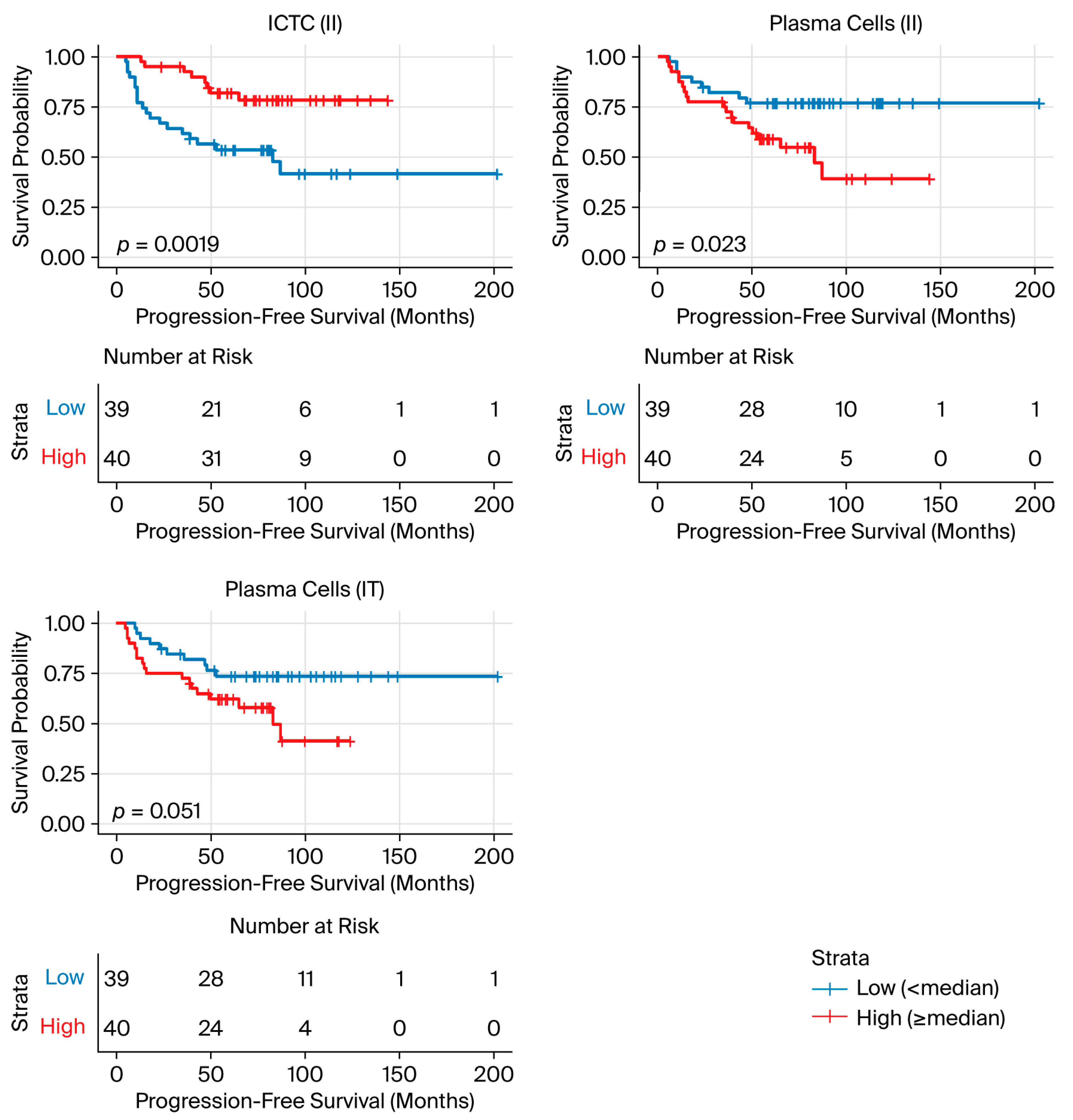 | Plasma cells (IT) | <5.62 | 10/39 (26%) | 0.051 | 1.27 (1.10, 1.46) | 0.001 | 0.009 |