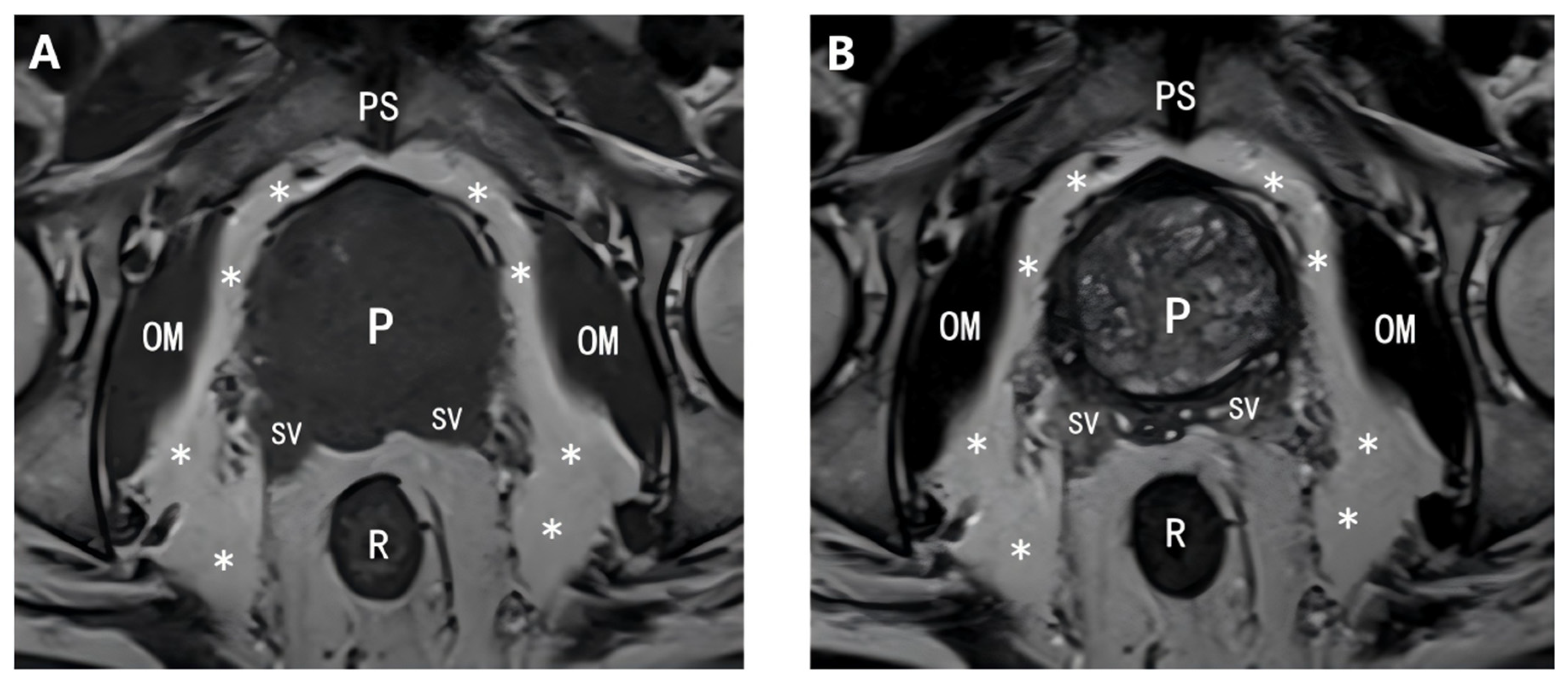- Zhai, T.-S.; Hu, L.-T.; Ma, W.-G.; Chen, X.; Luo, M.; Jin, L.; Zhou, Z.; Liu, X.; Kang, Y.; Kang, Y.-X.; et al. Peri-Prostatic Adipose Tissue Measurements Using MRI Predict Prostate Cancer Aggressiveness in Men Undergoing Radical Prostatectomy. J. Endocrinol. Investig. 2021, 44, 287–296. [Google Scholar] [CrossRef]