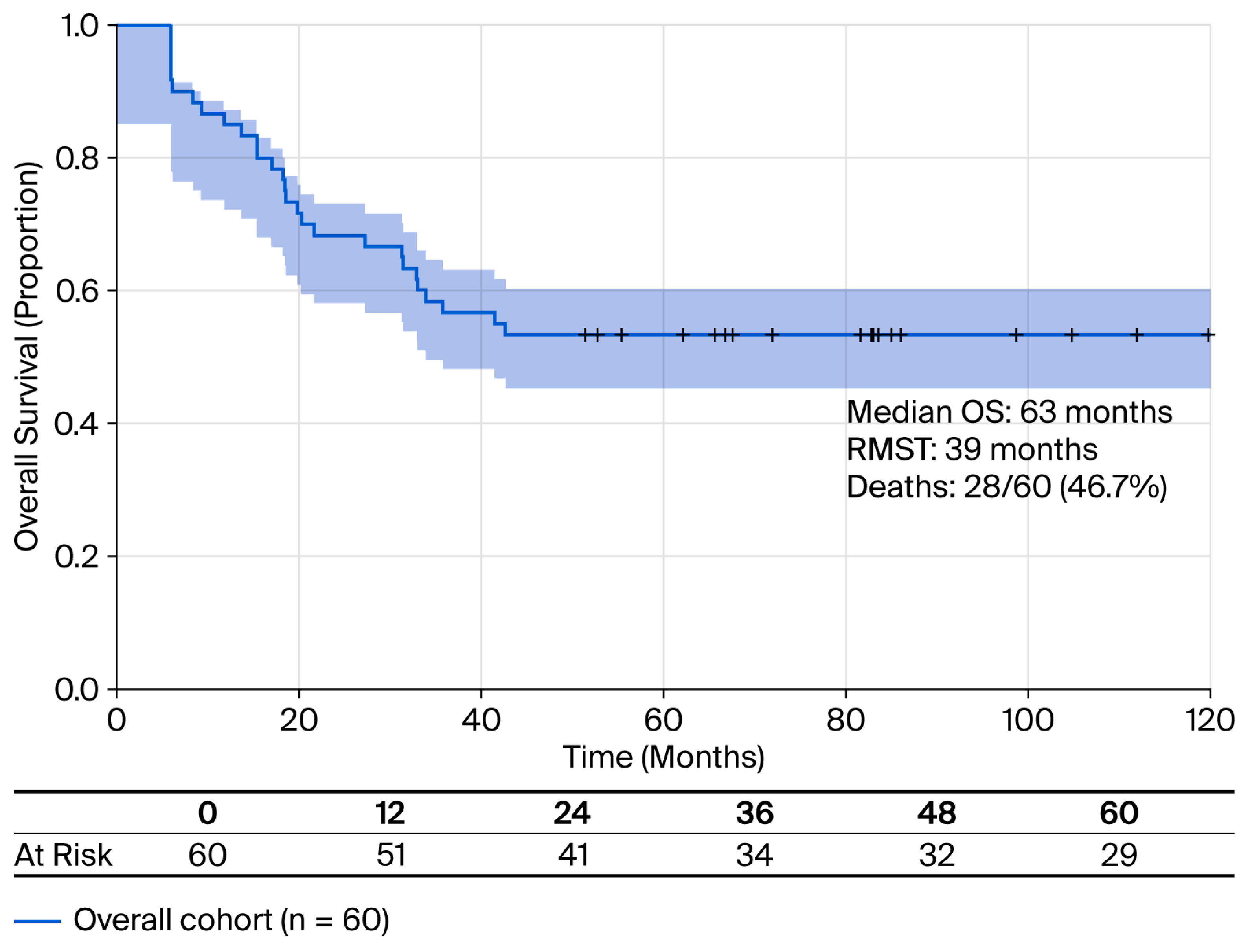 Kaplan–Meier survival curve for the entire cohort (N = 60). The median OS was 63 months with an RMST of 39 months. The shaded area represents a 95% confidence interval. During follow-up, 28 patients (46.7%) died. Tick marks indicate censored observations.
