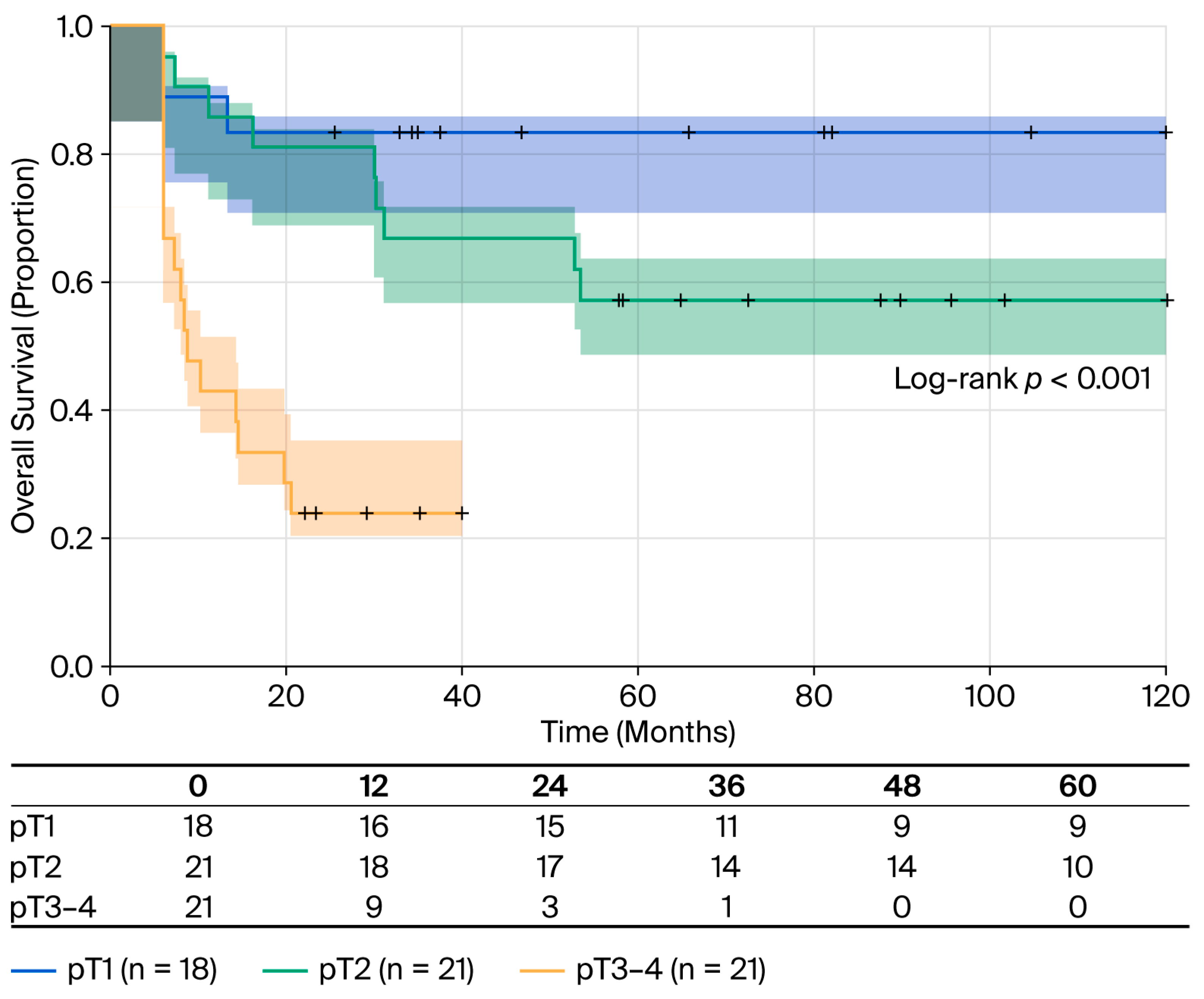 OS stratified by pathological T-stage. Kaplan–Meier survival curves stratified by pathological T-stage according to the AJCC 8th edition. pT1 (n = 18, blue line): RMST 54.4 months and 16.7% mortality (3/18); pT2 (n = 21, green line): median OS 63 months (95% CI: 17-NR), RMST 43.2 months, and 42.85% mortality (9/21); pT3–4 (n = 21, yellow line): median OS 10 months (95% CI: 6-NR), RMST 20.2 months and 76.19% mortality (16/21). Log-rank test p < 0.001. Shaded areas represent 95% confidence intervals. Tick marks indicate censored observations.