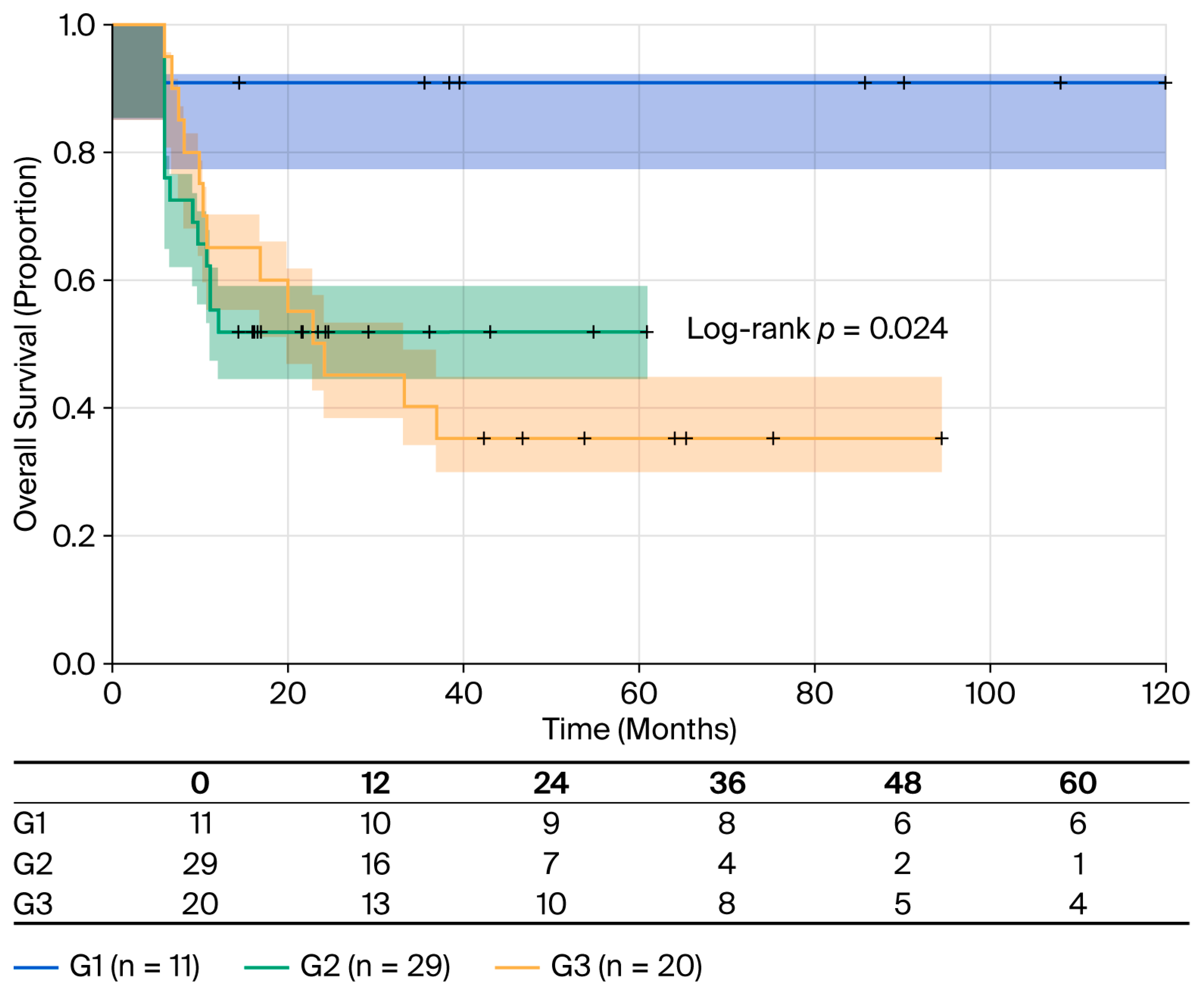 OS stratified by tumor grade: Kaplan–Meier survival curves stratified by tumor grade according to the WHO classification. G1 (n = 11, blue line): RMST of 53 months and 9.09% mortality (1/11); G2 (n = 29, green line): median OS of 19 months (95% CI: 12-NR), RMST of 34.1 months and 58.62% mortality (17/29); G3 (n = 20, yellow line): median OS of 20 months (95% CI: 9-NR), RMST of 35.6 months and 50% mortality (10/20). Log-rank test: p = 0.024. Shaded areas represent 95% confidence intervals. Tick marks indicate censored observations.