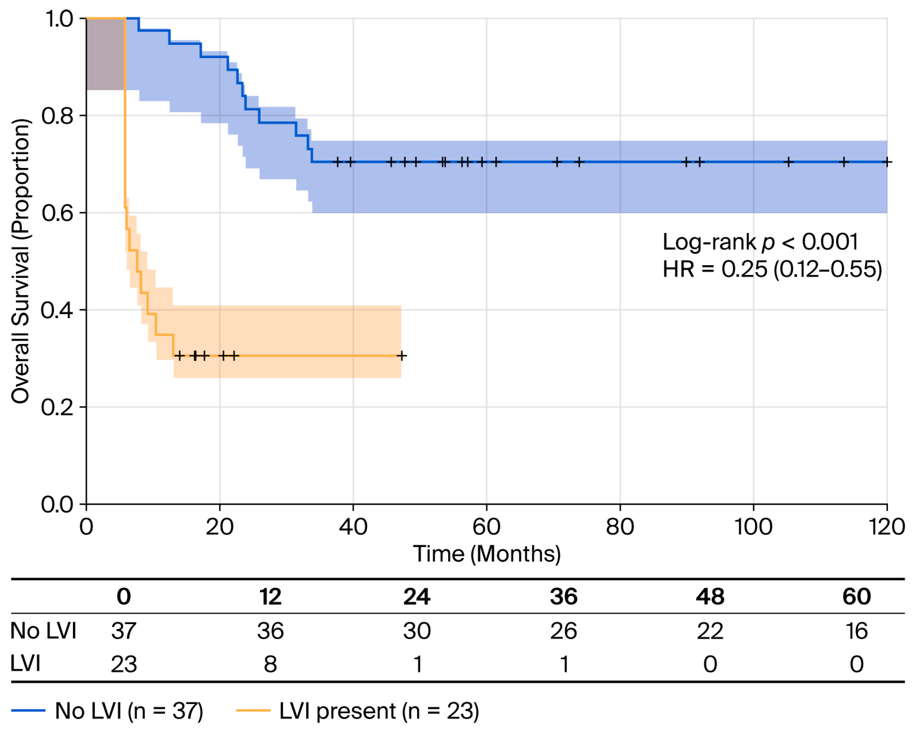 OS stratified by LVI status. Kaplan–Meier survival curves comparing patients with lymphovascular (LVI; n = 23, yellow line) and without lymphovascular invasion (n = 37, blue line). Patients without LVI had significantly better survival (RMST 45.8 months) compared to those with LVI (RMST 19.4 months). Mortality rates: 32.43% (12/37) without LVI versus 69.56% (16/23) with LVI. Log-rank test: p < 0.001. Shaded areas represent 95% confidence intervals. Tick marks indicate censored observations. HR = 0.25 (95% CI: 0.12–0.55, p < 0.001) for absence versus presence of LVI.