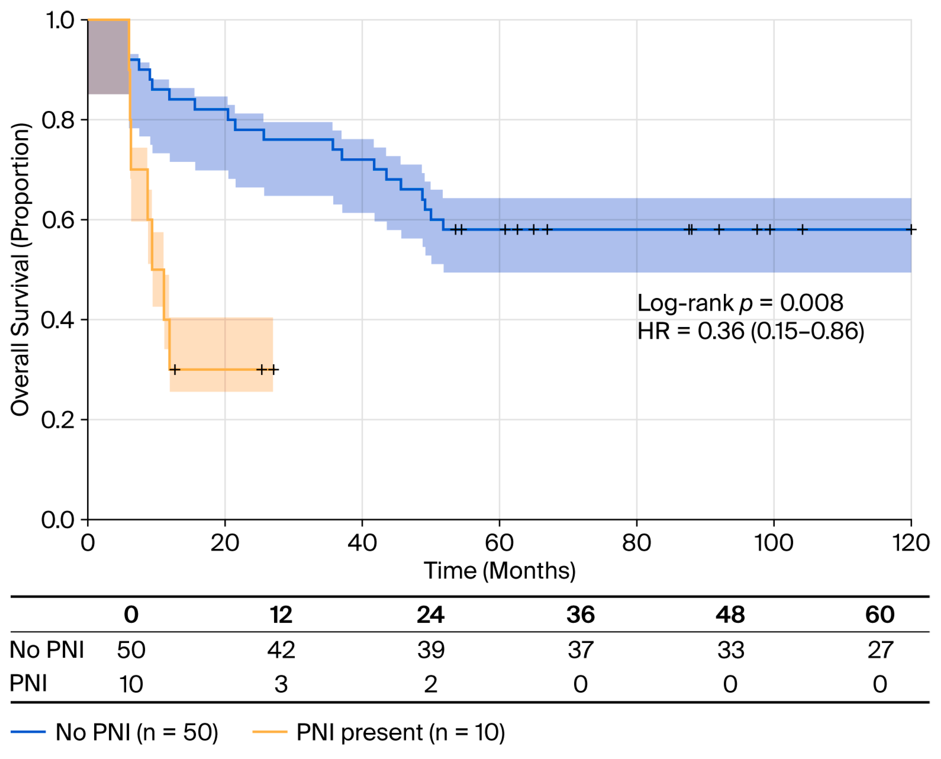 OS stratified by PNI status. Kaplan–Meier survival curves comparing patients with perineural invasion (PNI; n = 10, yellow line) to those without PNI (n = 50, blue line). Patients without PNI had significantly better survival (median OS 63 months; 95% CI: 20-NR; and RMST 41.9 months) compared to those with PNI (median OS 10 months; 95% CI: 6-NR; and RMST 23.4 months). Mortality rates: 42.0% (21/50) without PNI versus 70.0% (7/10) with PNI. Log-rank test p = 0.008. Shaded areas represent 95% confidence intervals. Tick marks indicate censored observations. HR = 0.36 (95% CI: 0.15–0.86, p = 0.022) for absence versus presence of PNI.