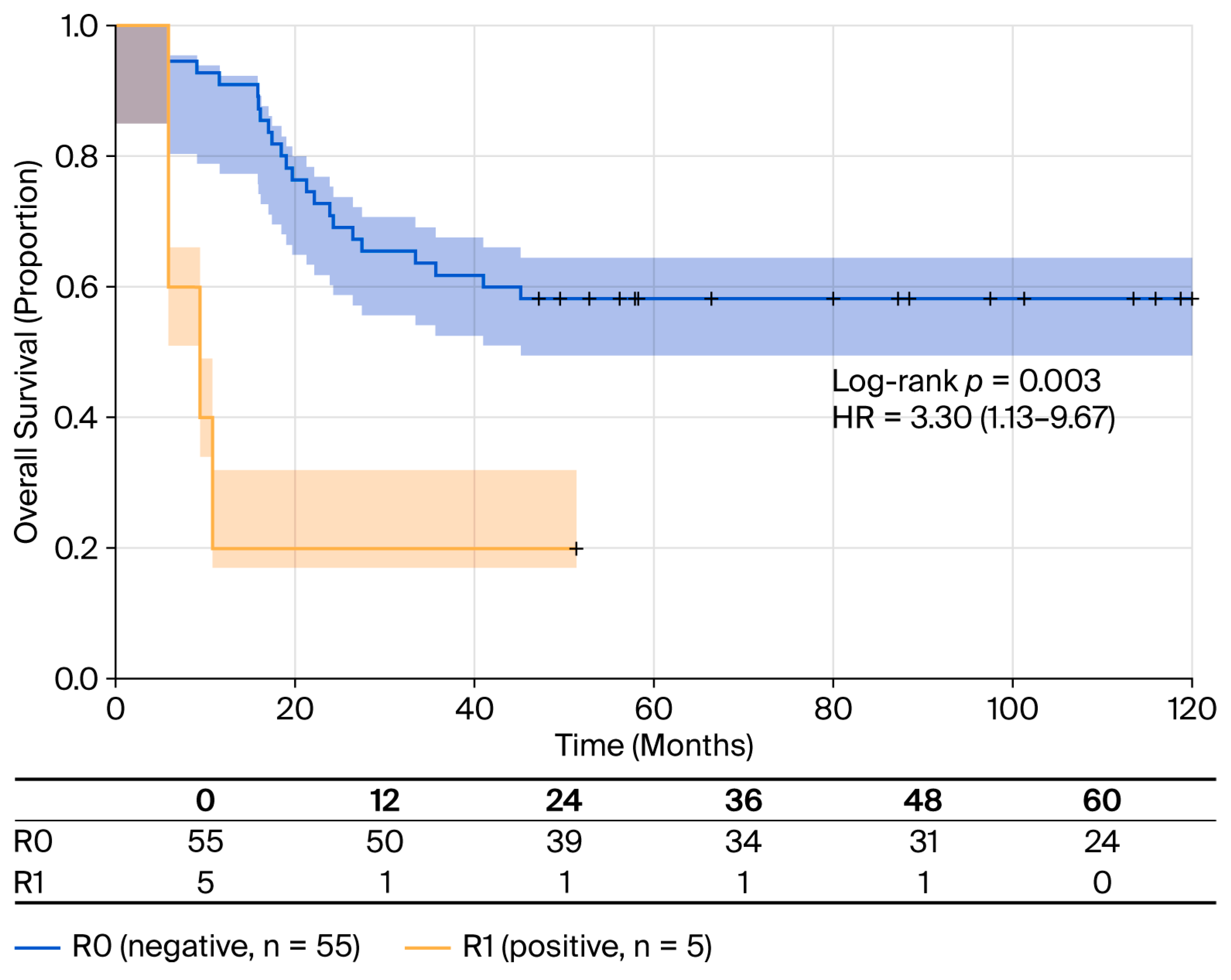 OS stratified by surgical margin status. Kaplan–Meier survival curves comparing patients with positive surgical margins (R1; n = 5, yellow line) and negative margins (R0; n = 55, blue line). Patients with R0 resection had significantly better survival outcomes (median OS 63 months; 95% CI: 19 - NR; and RMST 40.8 months) compared to those with R1 resection (median OS 10 months; 95% CI: 7 - NR; and RMST 15.4 months). Mortality rates: 43.63% (24/55) for R0 versus 80.0% (4/5) for R1. Log-rank test: p = 0.003. Shaded areas represent 95% confidence intervals. Tick marks indicate censored observations. HR = 3.30 (95% CI: 1.13–9.67; p = 0.030) for R1 compared to R0.