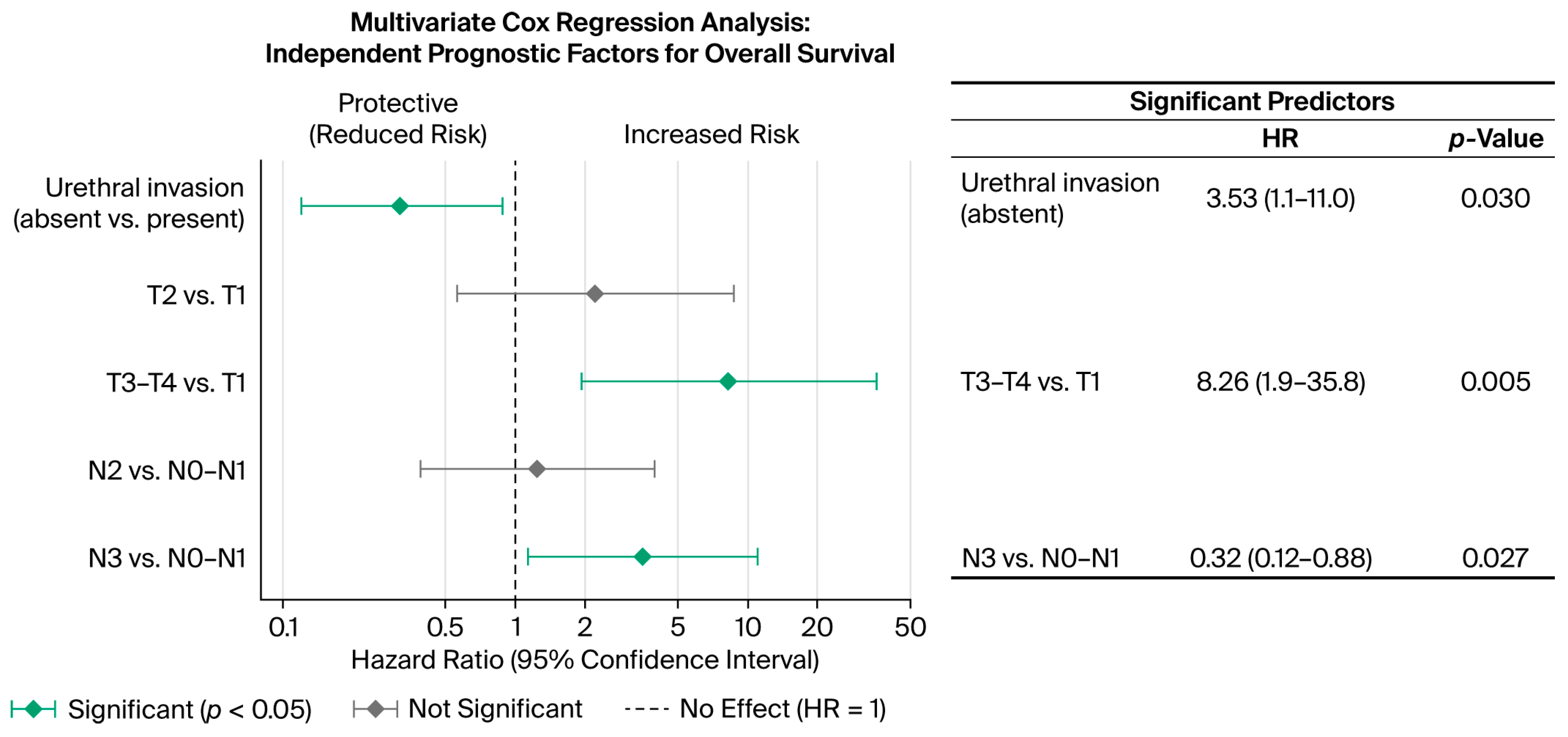 Multivariate Cox regression analysis of prognostic factors for OS. Forest plot displays hazard ratios (HRs) with 95% confidence intervals (CIs) from multivariate Cox proportional hazards regression analysis. Diamond markers represent HR point estimates; horizontal lines show a 95% CI. Green indicates statistically significant independent predictors (p < 0.05); gray indicates non-significant variables. A dashed vertical line at HR = 1.0 represents no effect. The right panel summarizes three significant predictors: absence of urethral invasion (HR = 0.32; p = 0.027), T3–T4 stages (HR = 8.26; p = 0.005), and N3 disease (HR = 3.53; p = 0.030). The X-axis is presented on a logarithmic scale.